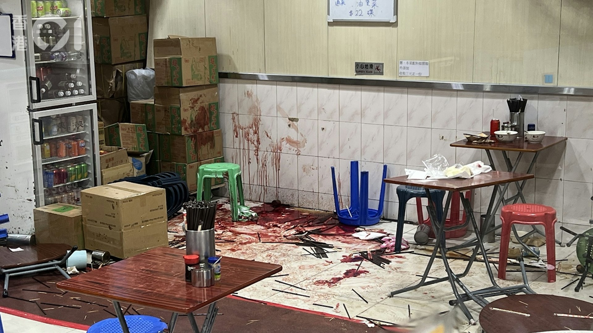 案發現場為大角咀英記油渣麵。事發後店內相當凌亂,血花四濺。店內設有閉路電視,警員正調查事發組過。(李家傑攝)