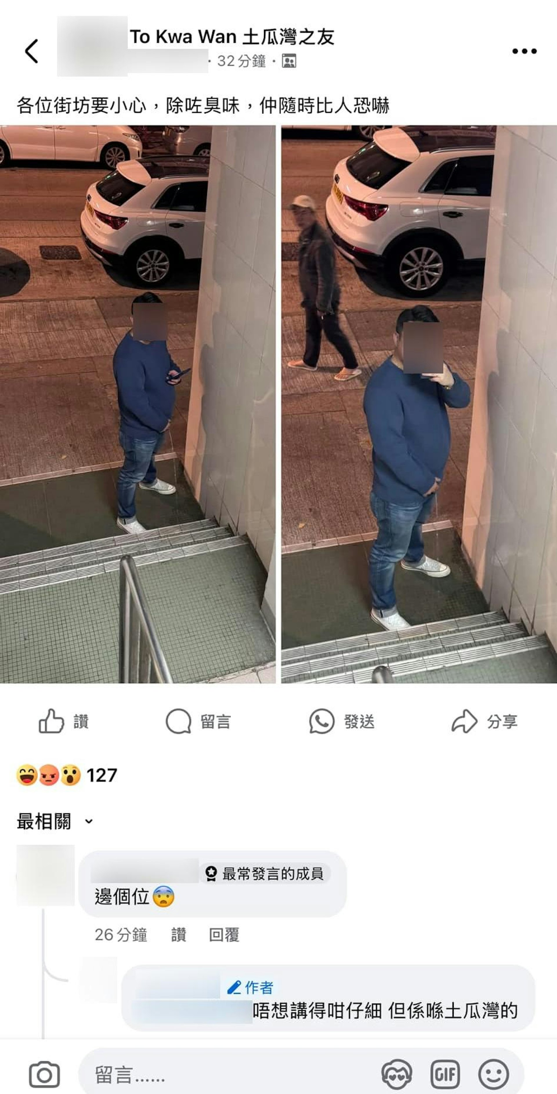 3 U2 O; X8 |7 x+ o4 |( v$ G! u公仔箱論壇該網友在Facebook 群組「To Kwa Wan 土瓜灣之友」發文,並附上照片,可見1名穿藍色上衣的男子站在某大廈出入口,對著牆角公然便溺,而且拿著手機在查閱,旁邊馬路有多輛汽車停泊,行人路不時有人經過。貼文指出,男子發現被拍照後,在小便途中隨即舉機反拍,樓主直言:「各位街坊要小心,除咗臭味,仲隨時畀人恐嚇。」他透露不想公開詳細地點,但希望提醒附近街坊注意。