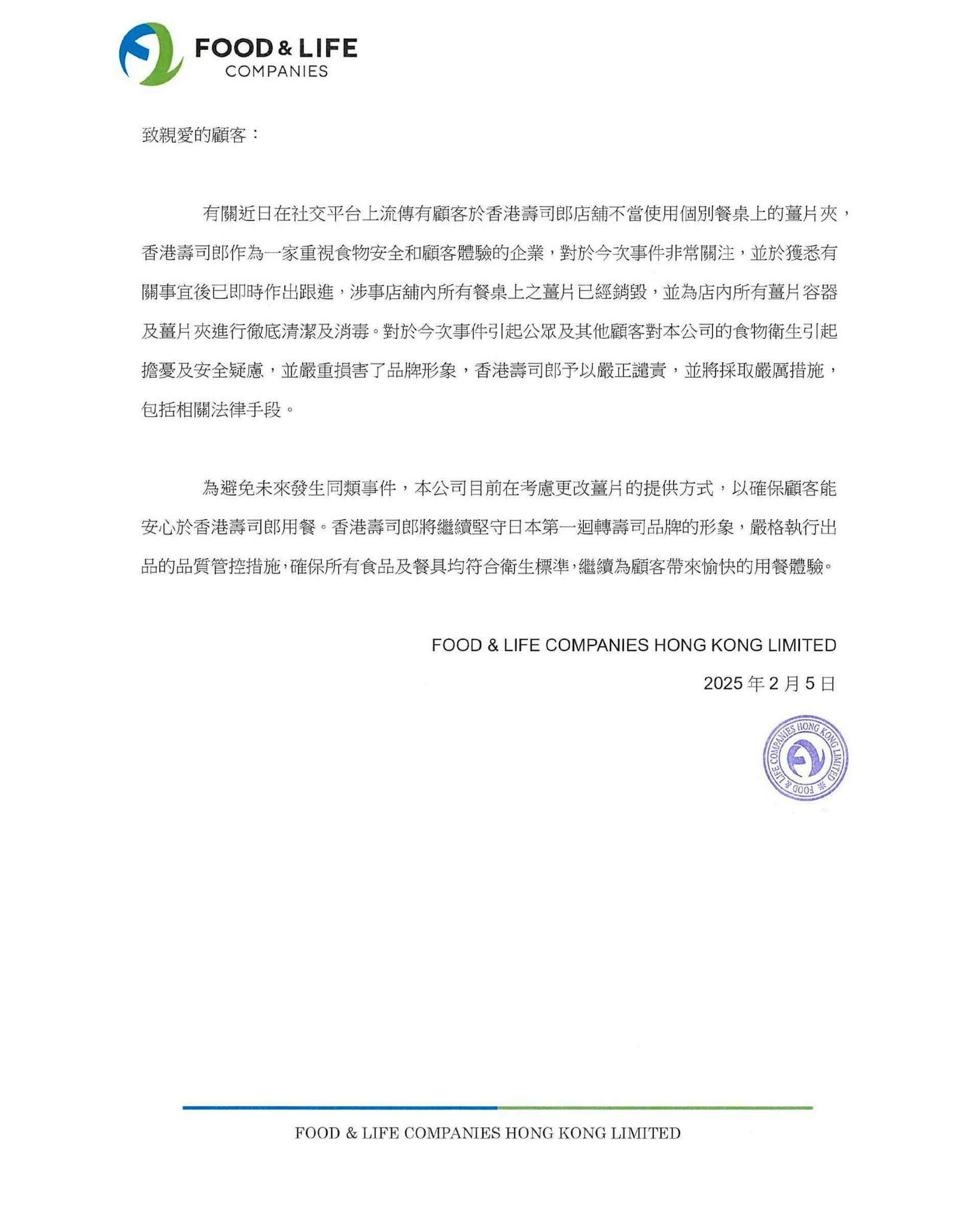 香港壽司郎今日(5日)於官方facebook發聲明指出,「涉事店舖內所有餐桌上之薑片已經銷毀,並為店內所有薑片容器及薑片夾進行徹底清潔及消毒」,又對事件予以嚴正譴責,並將採取嚴厲措施,包括相關法律手段,另為避免未來發生同類事件,目前在考慮更改薑片的提供方式。