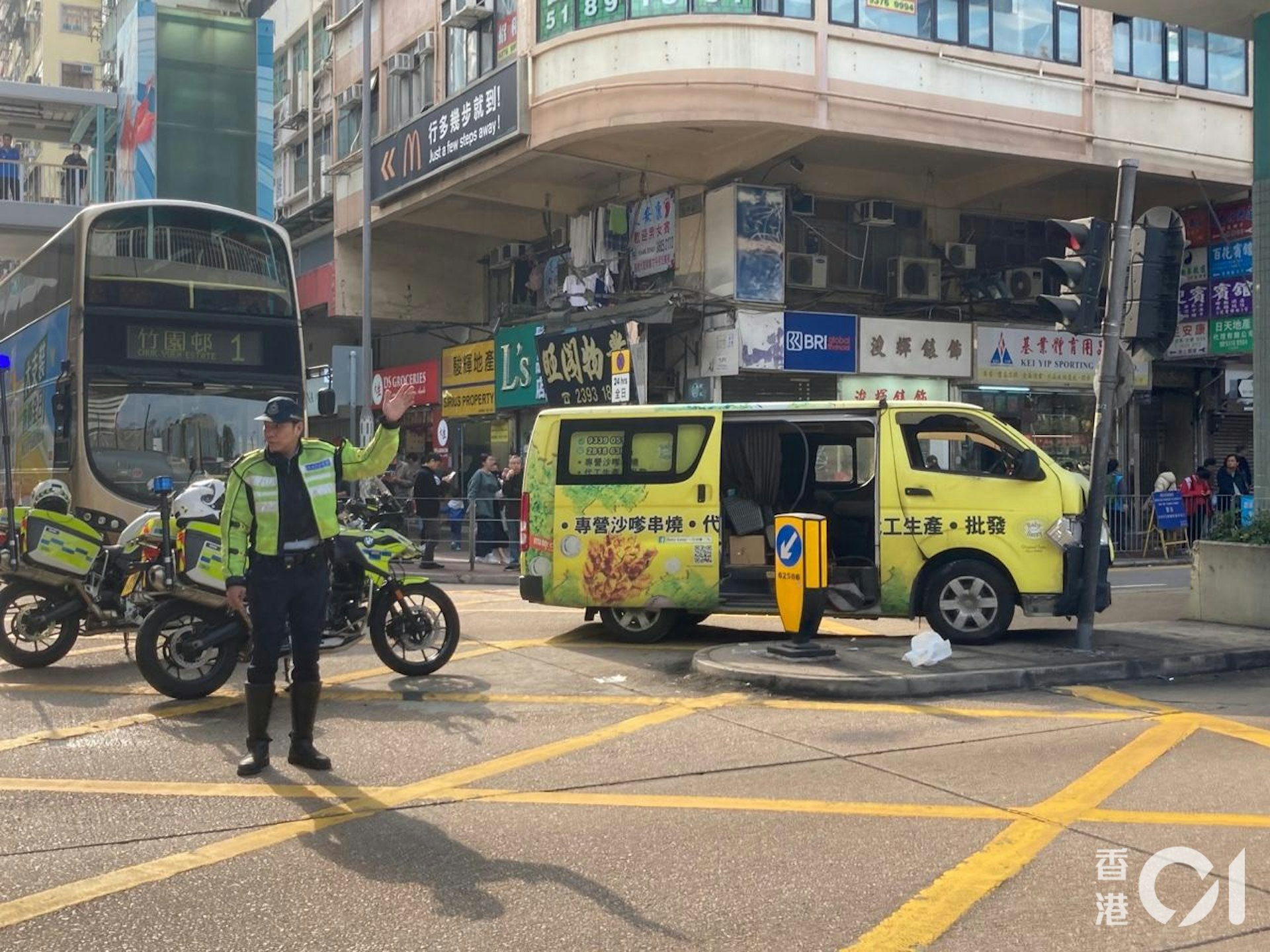 3 q% d c( m1 F! t# C1 s2 E公仔箱論壇旺角道與洗衣街交界發生交通意外,一名客貨車司機疑駕車時暈倒,失控撞壆及撞交通燈。(曹德熙攝) |