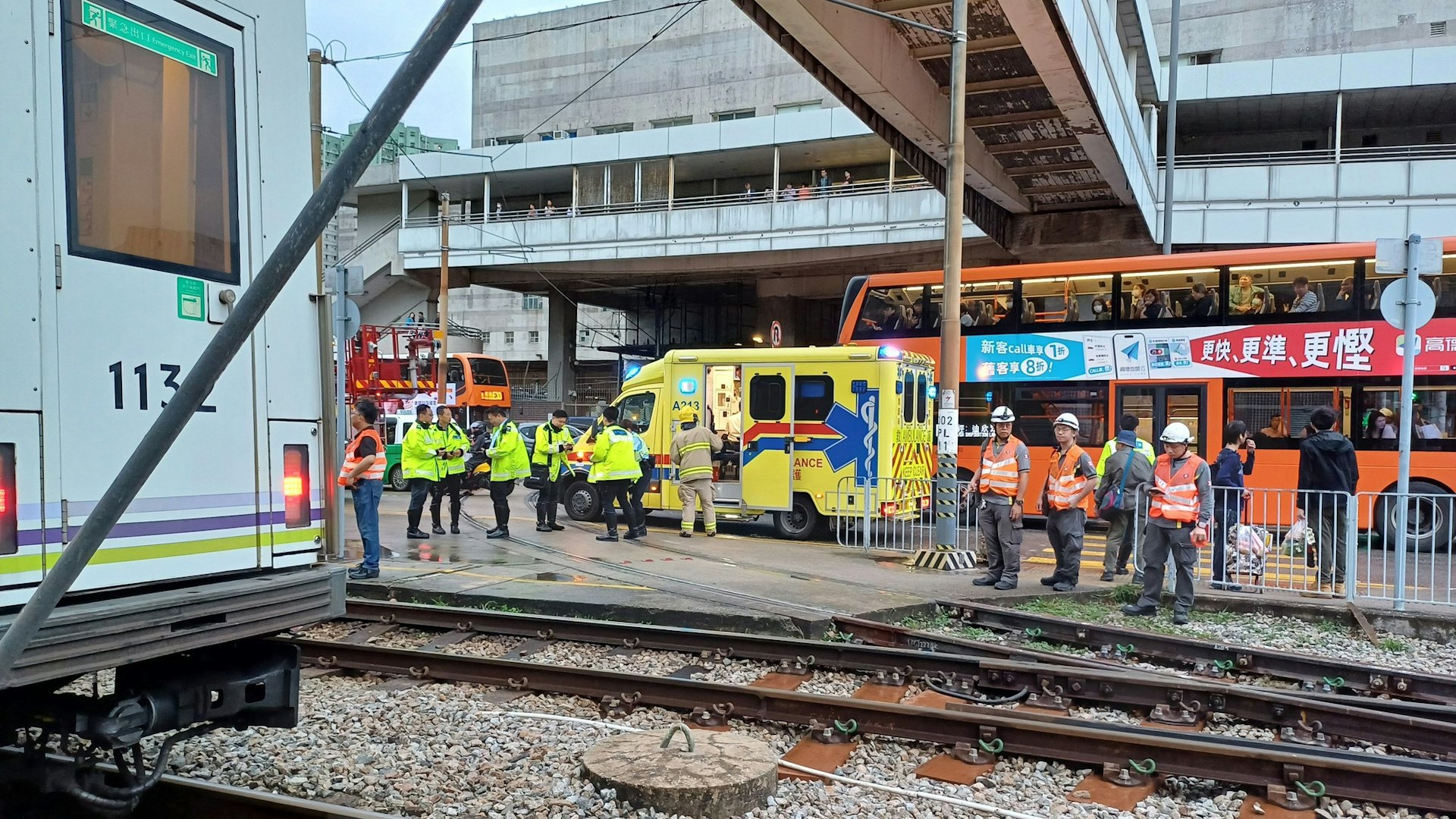 : z( x# v3 s# v% x7 Z O3 c一名途人遭一輛由屯門往元朗方向的輕鐵列車撞倒,傷者被困車底。(Facebook 屯門公路塞車關注組Adolf Cheung )