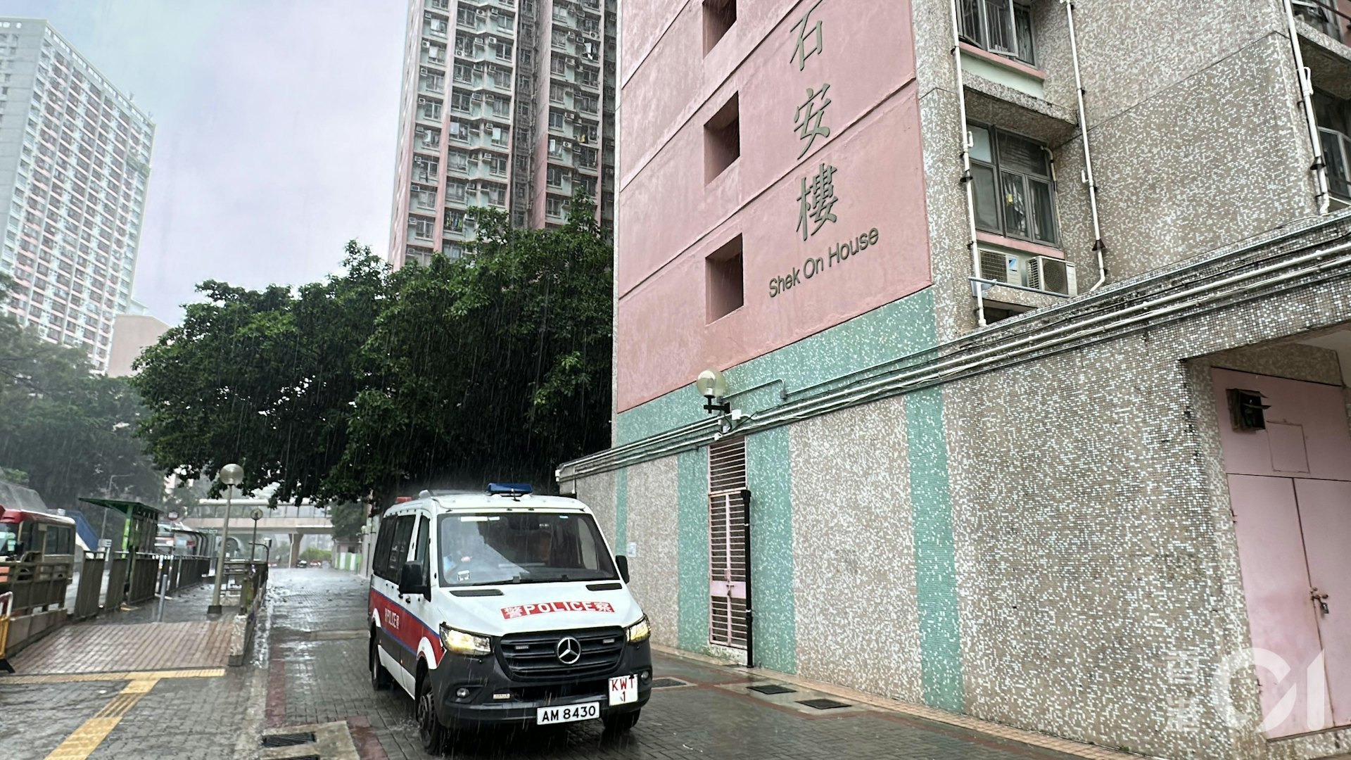 今午有警員仍在事發樓層看守。(香港01記者攝)" y/ T& H1 Y$ y7 @9 Y