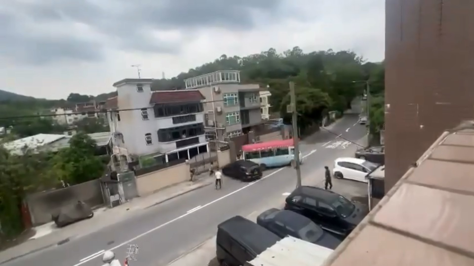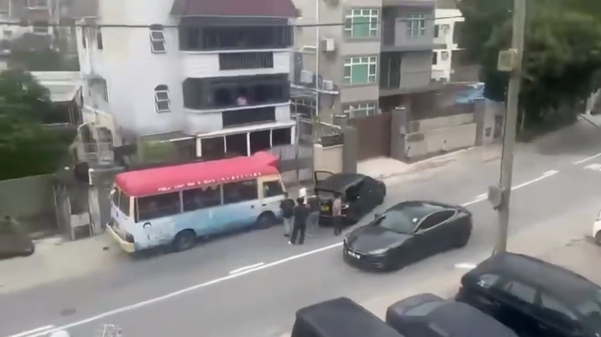 ; D2 N; ]# e, n7 K/ f片段拍攝日期不可考,地點在元朗大棠路270號對開。影片一開始見5名男子,將黑色私家車車橫亙往大棠方向路段,下車圍在一輛紅VAN前面,似有爭執。(網上片段截圖)