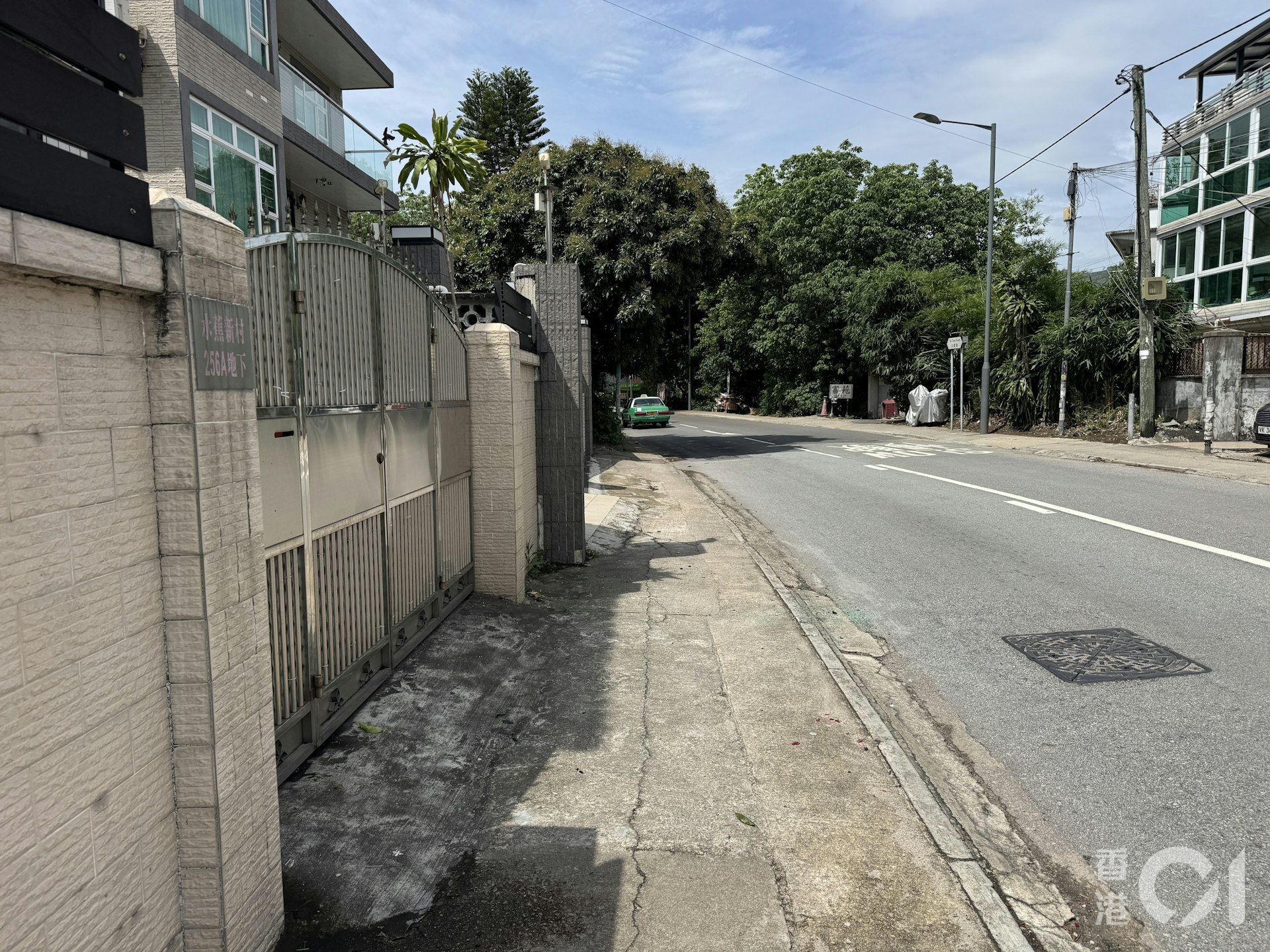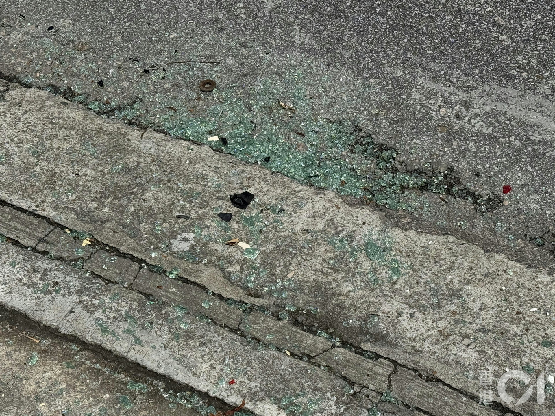 元朗大棠一輛紅VAN與人爭執,褪後駛前撞車撞人,現場遺下一些玻璃碎片。(蔡正邦攝)os.tvboxnow.com& v5 t/ a6 z+ w0 [