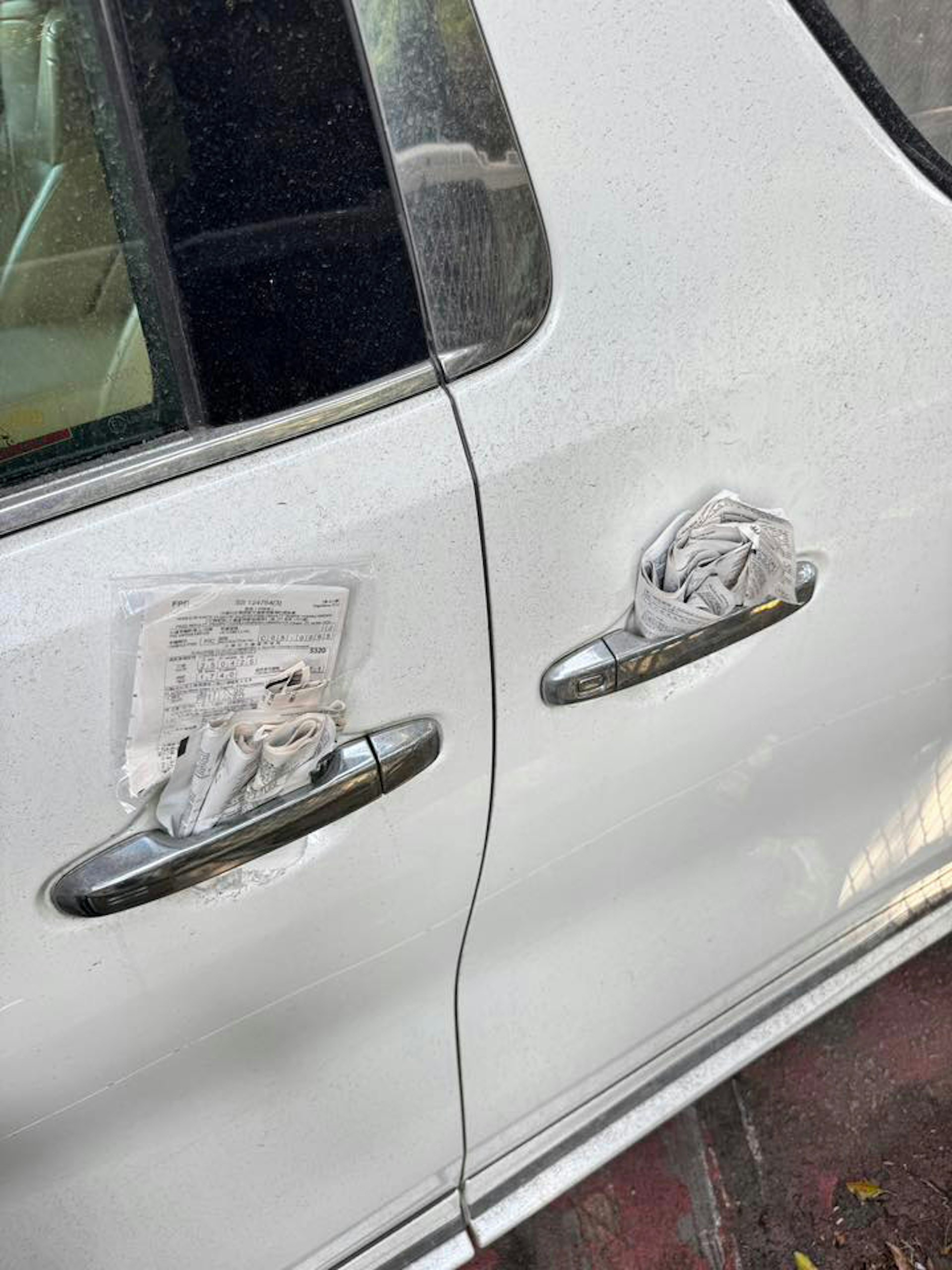 青山公路汀九段一輛七人車,由1月至今收到逾百張違例泊車告票,「牛肉乾」被揳在車頭水撥和車身左邊車門的手把。(fb馬路的事討論區(進修常理版))