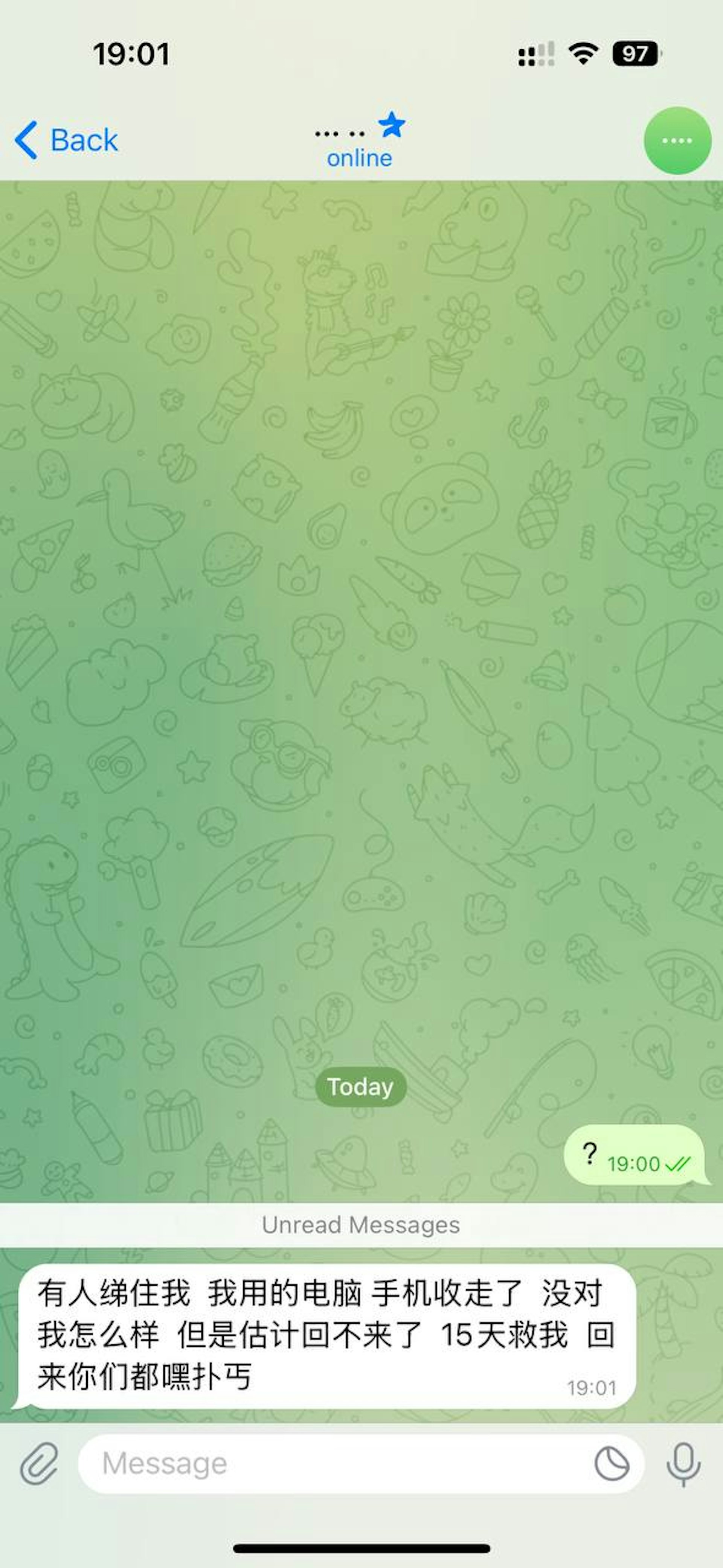 8 p2 o9 ?. v1 O5 F: g: j5 ~張先生亦一直嘗試透過Facebook、Instagram、telegram等不同的通訊軟件,與表弟聯絡。直至今日晚上7時,他透過telegram發出一個問號後,很快獲得回覆,以簡體字回覆:「有人綈住我,我用的電腦,手機收走了,沒對我怎麼樣,但是估計回不來了,15天救我,回來你們都嘿扑丏」。他嘗試再與其通訊,但該帳戶其後已封鎖。他指情況絕不正常,表弟向來用繁體字白話對話,相信他是受到控制,但對方卻一直沒有提出贖金。公仔箱論壇* s( F) ]6 ^- }: m
