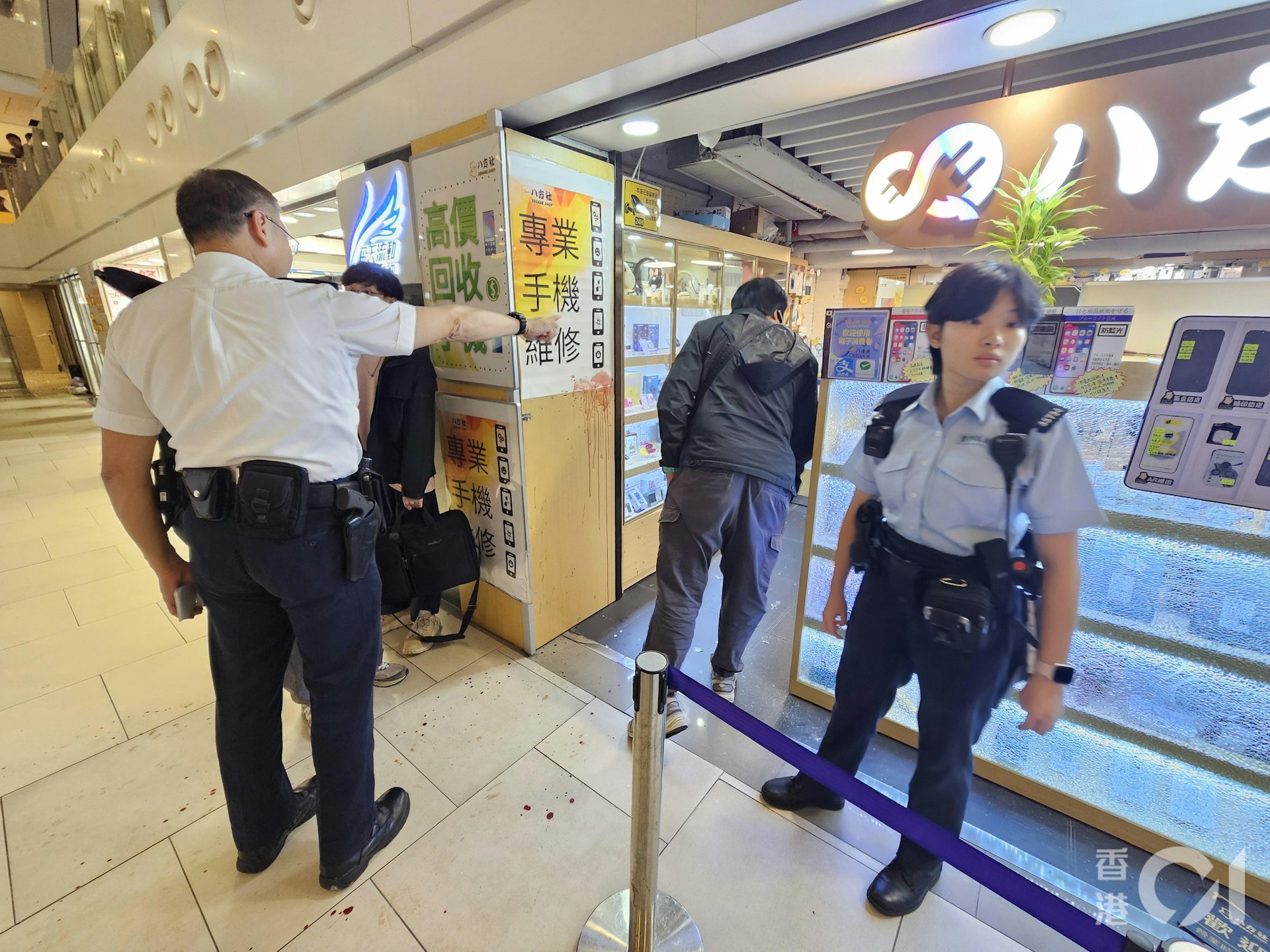 屯門良景商場有斬人案發生。涉事手機舖店主(左)到場助查。(梁偉權攝)% K4 n+ [- Y* Y2 o1 d8 e, a