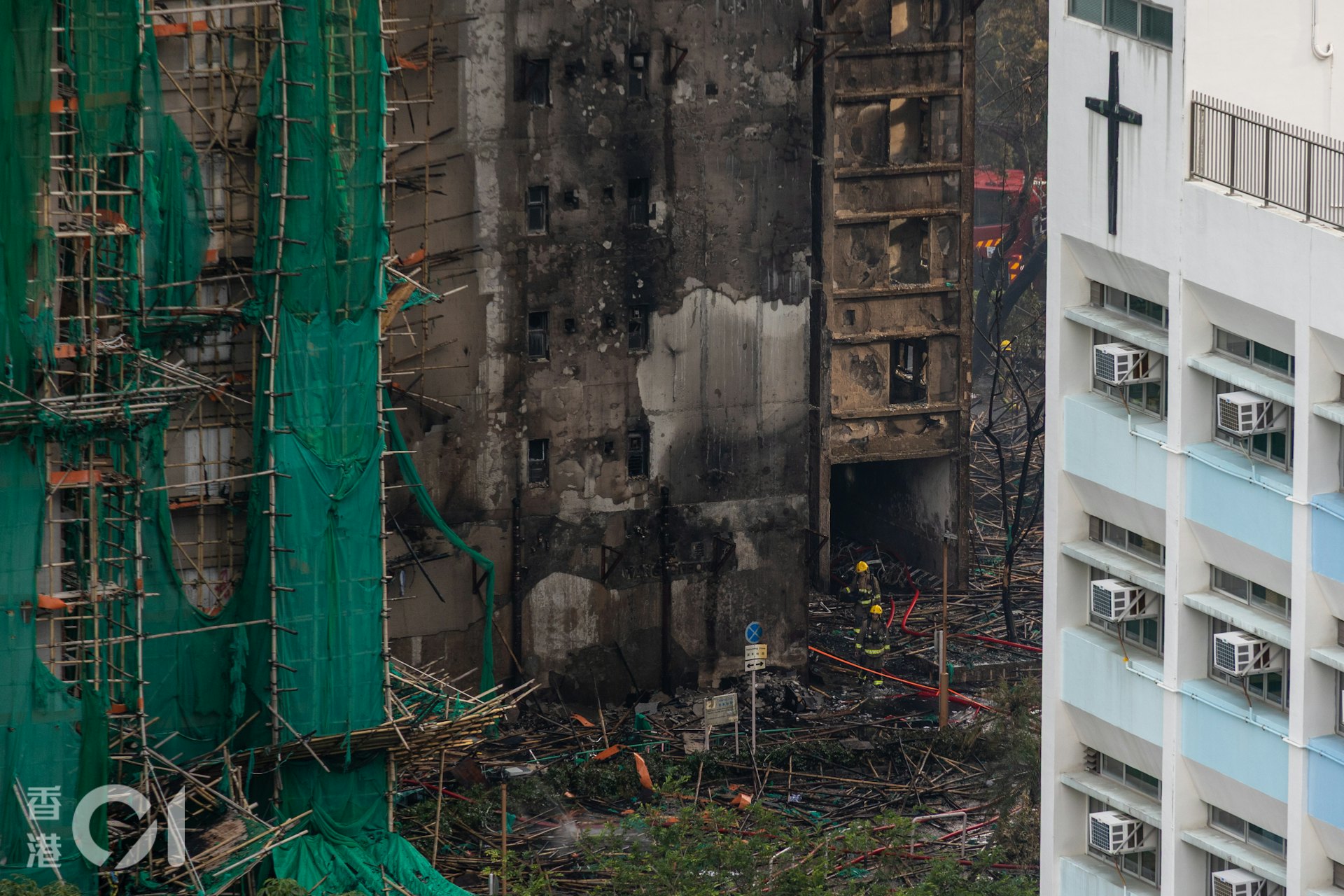 宏福苑火警第三日,早上9時,單位沒有再見火舌。(翁鈺輝攝)tvb now,tvbnow,bttvb5 H- {; s1 @- Q5 A