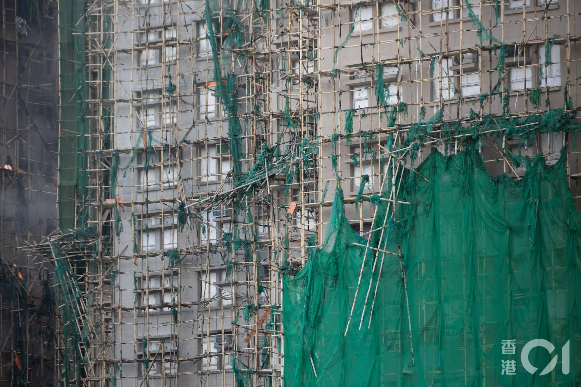 8 a% F6 |" v- S7 @7 w公仔箱論壇宏福苑11月26日發生五級火,外牆棚網燒燬後,可見牆上有不少發泡膠。(梁鵬威攝)