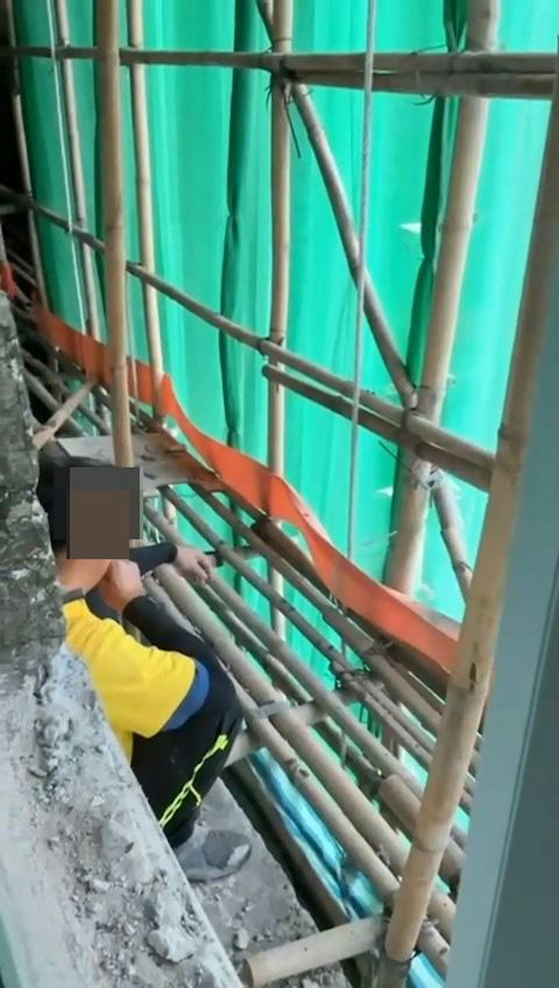 2 G. k) x4 [ a2 ^' f. u- Rtvb now,tvbnow,bttvb11月底有影片顯示,穿上橙黃色維修工人制服的男子,蹲坐在石屎上吸煙,煙霧彌漫,離棚架相當近,而他眼前就是綠色的圍網。未知影片何時拍攝,亦不確定地點是否大埔宏福苑。(Threads@jackyyy0728)