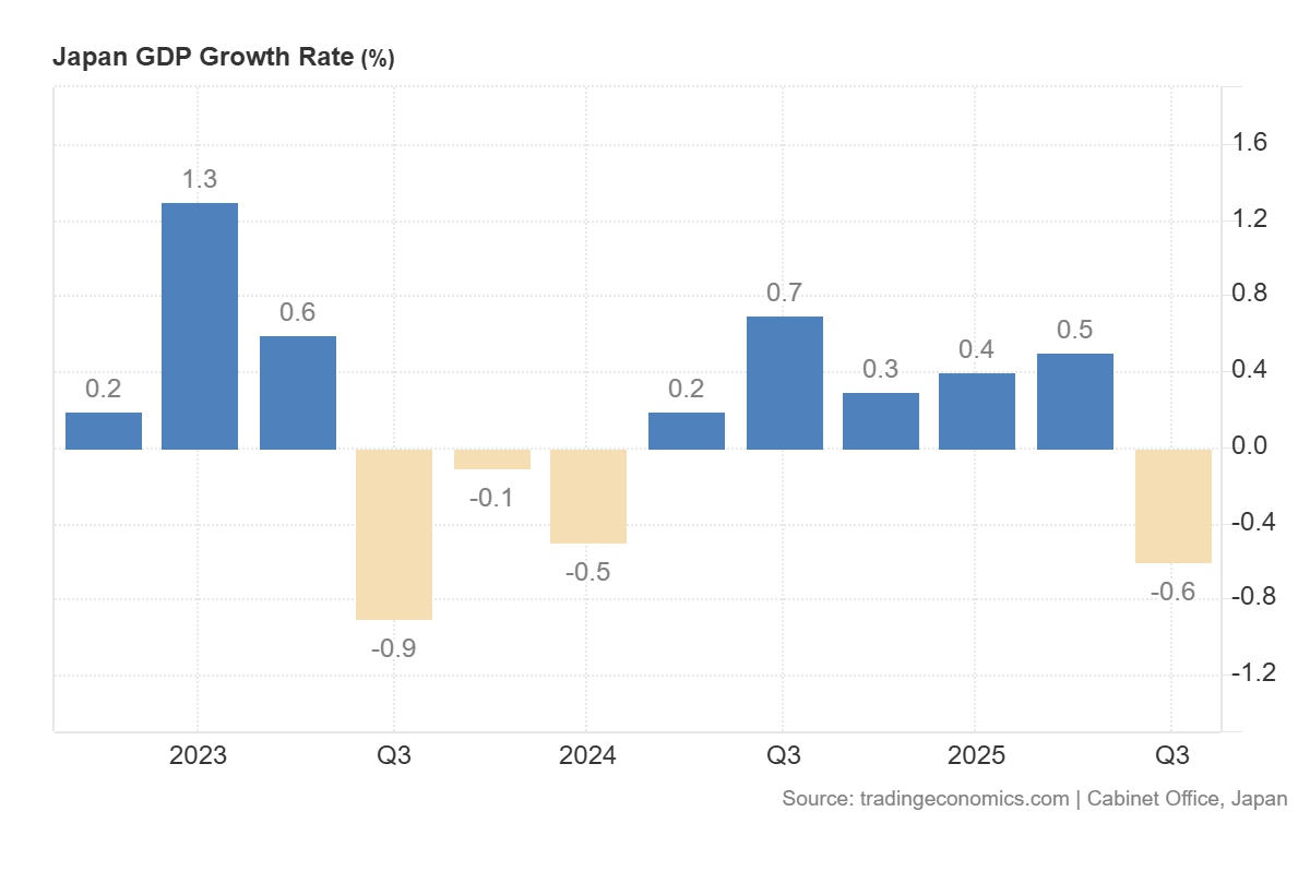 日本2025年第三季GDP較上季萎縮0.6%,降幅超過先前0.4%的初步估計值和市場預期的0.5%。(trading economics)os.tvboxnow.com2 S1 F& Q. F$ d2 K