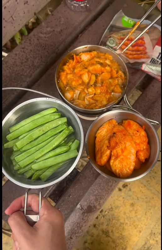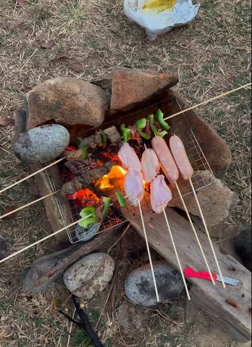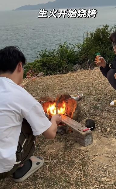 其上載片段顯示,一行人在草地搭營及島上觀光後,開始準備燒烤食材,有蝦、雞翼、蔬菜、串燒等,燒烤爐以石頭加鐵絲網搭建,燃起木塊後火光熊熊。此外,他們也準備了小型燃氣罐及簡單爐具,於鏡頭前示範了「潮汕魷魚烤法」,至於烤不熟的食材則直接白灼,還自備了調味料。畫面也顯示,他們翌日煮了公仔麵等,食物頗為豐富。