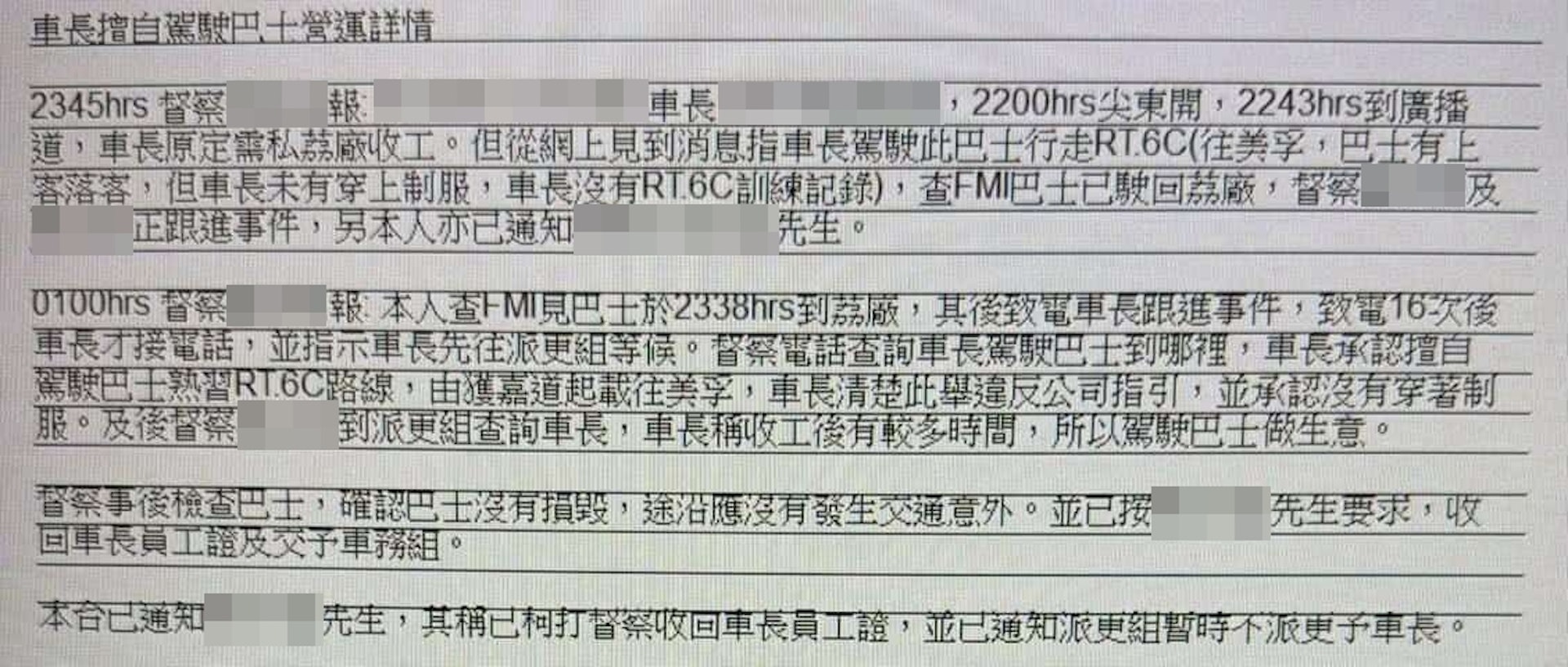 網上瘋傳一名九巴208號線車長,竟然在未獲批准、沒穿制服之下,擅自駕駛未受訓練的6C號線,接載乘客由紅磡前往美孚。事件令網民震驚,「仲要載客個(嗰)下癲!」、「訓練的話就必須有指導人員」。