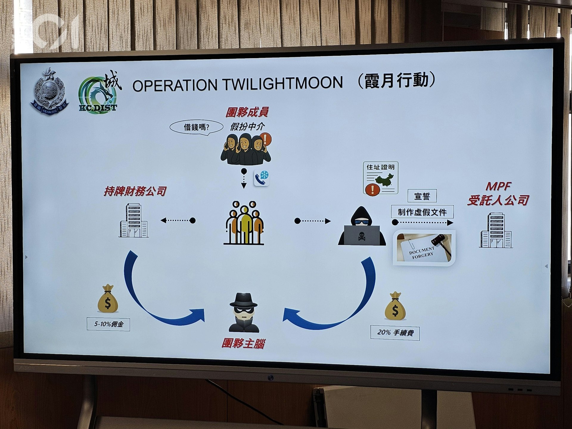 集團骨幹成員通常以網上方式,與不同客戶溝通,大大增加警方調查案件難度。 行動中,警方在葵涌的工廈單位內,一共檢取5部電腦、40部手提電話、4張電話卡、1部影印機以及1057份提取強積金或貸款申請表。據警方證物顯示,電話放債中心設有講稿台詞,向市民推銷,當中標榜「 不成功不收費」、「不會有任何負面記錄」、「不會通知僱主家人」及「處理時間短」。