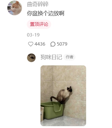 網友們一看,懷疑是不是貓砂盆的朝向放得不對,心想矮的一邊入口方向朝着外邊,貓咪上廁所時肯定就更方便了,這樣貓就不會踩到貓砂盆邊緣上了吧。