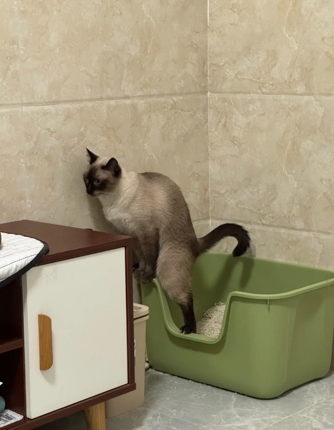 鏟屎官主打一個聽勸,換方向就換方向,馬上把貓砂盆矮的一邊入口朝向外邊。