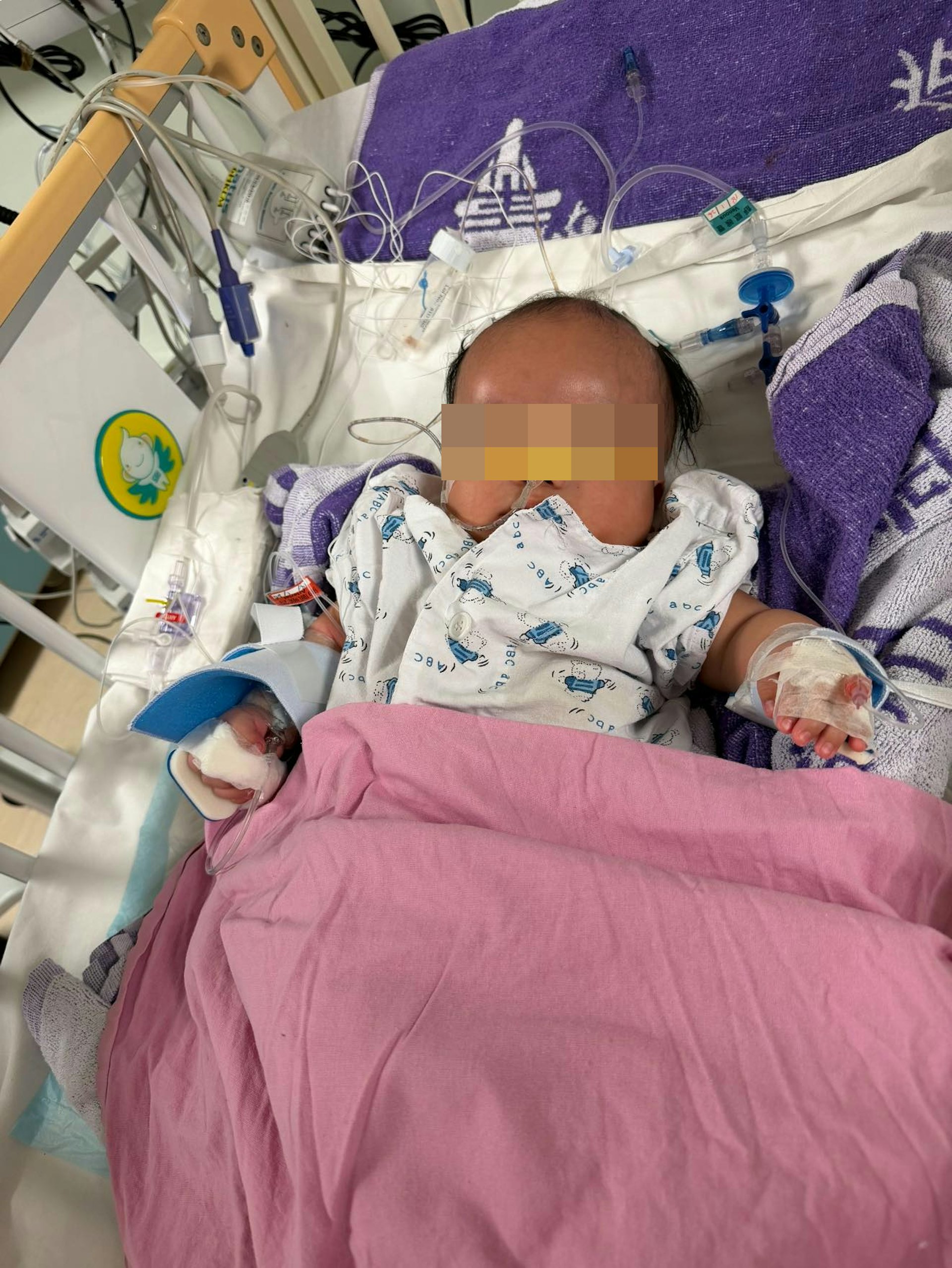 4個月大男嬰「細波」疑遭外傭大動作搖晃及叉頸虐待,導致腦出血要接收緊急手術,在醫院兒童深切治療部留醫。 (「細波」父親盧先生提供)