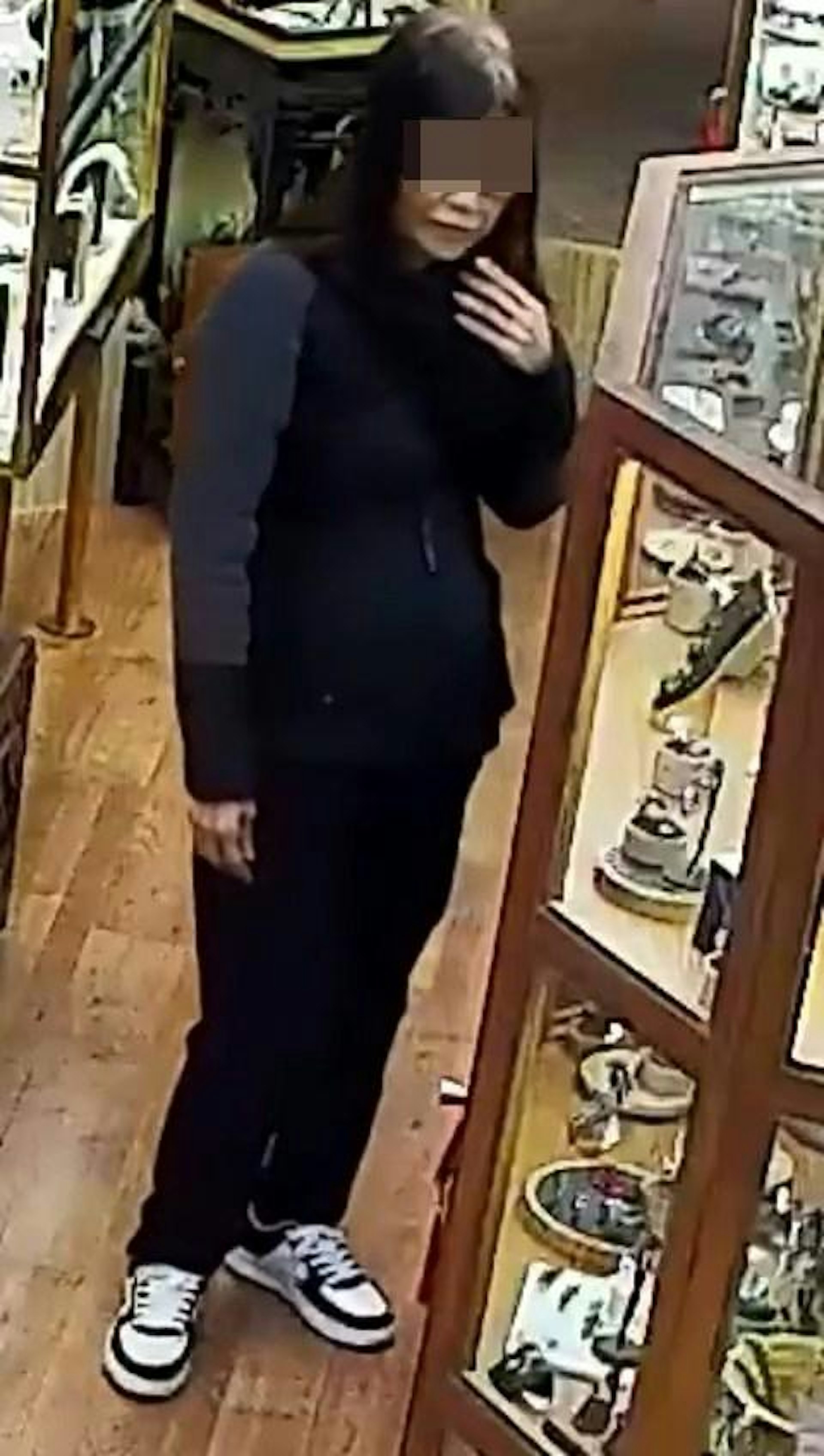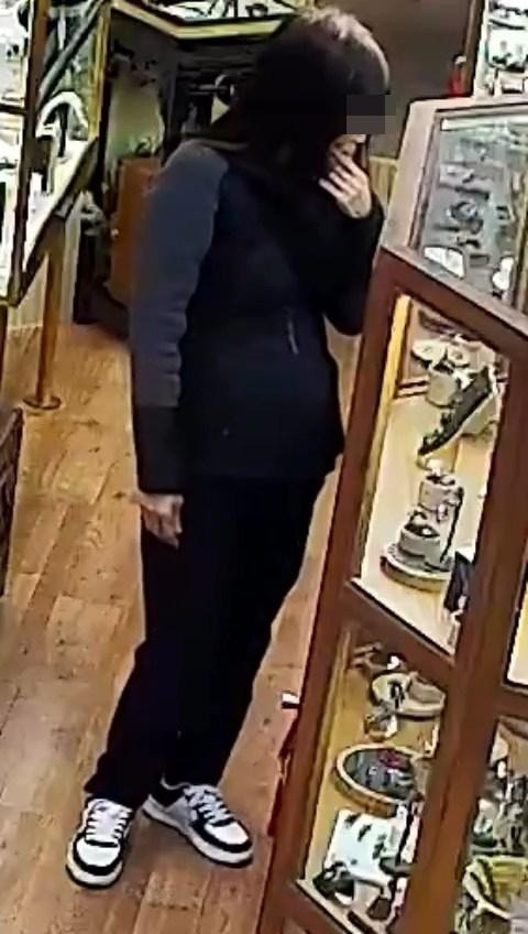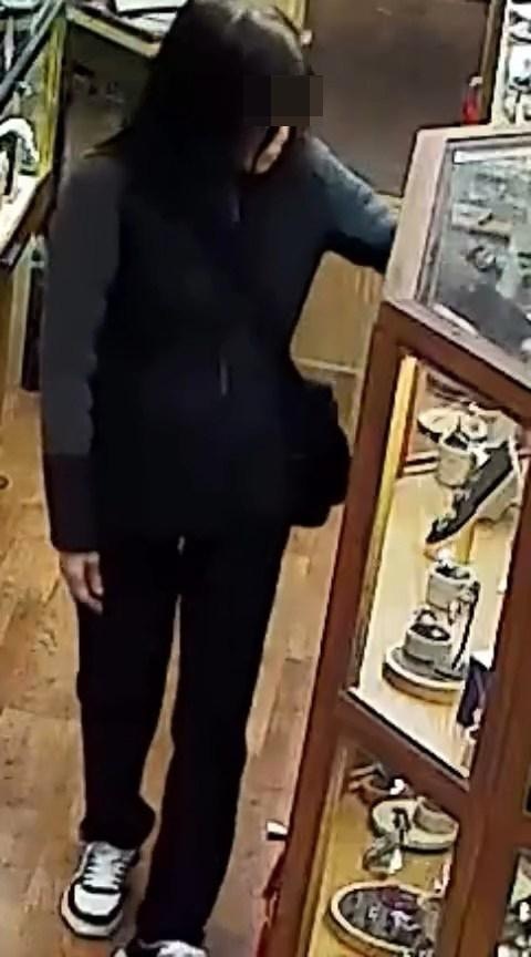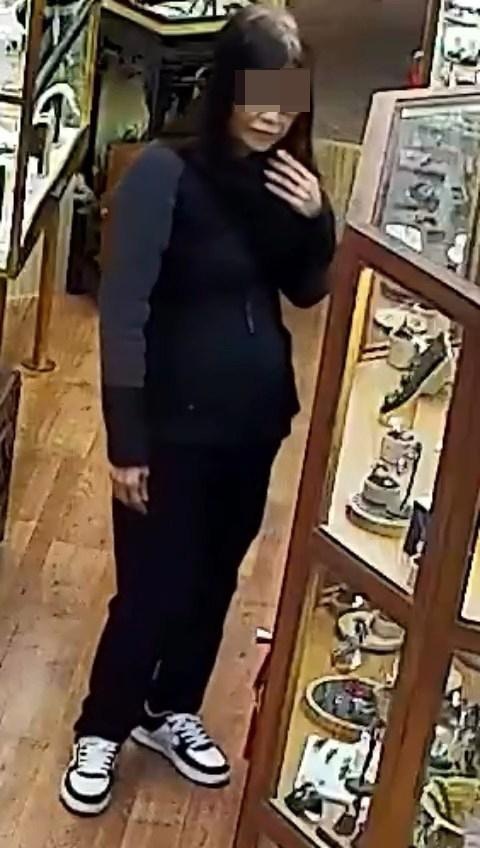穿深色衣服、上年紀女子於店內貨架旁徘徊,裝作觀看貨品的同時,不時望向遠方疑似店員方向,又觸摸貨品,狀甚鬼祟。