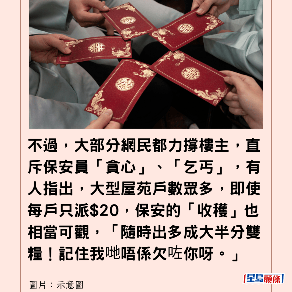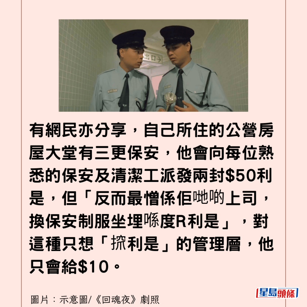 有網民亦分享,自己所住的公營房屋大堂有三更保安,他會向每位熟悉的保安及清潔工派發兩封$50利是,但「反而最憎係佢哋啲上司, 換保安制服坐埋喺度R利是」,對這種只想「 |