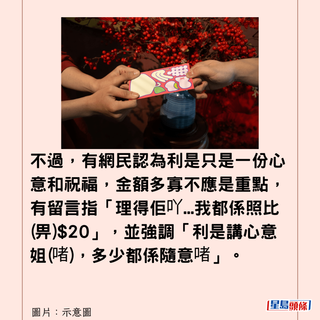 不過,有網民認為利是只是一份心意和祝福,金額多寡不應是重點,有留言指「理得佢吖...我都係照比(畀)$20」,並強調「利是講心意姐(啫),多少都係隨意啫」。os.tvboxnow.com& I* u6 ~# P: ~% \! h7 E