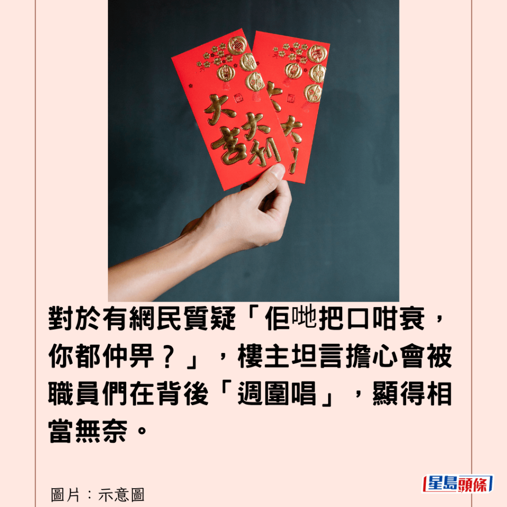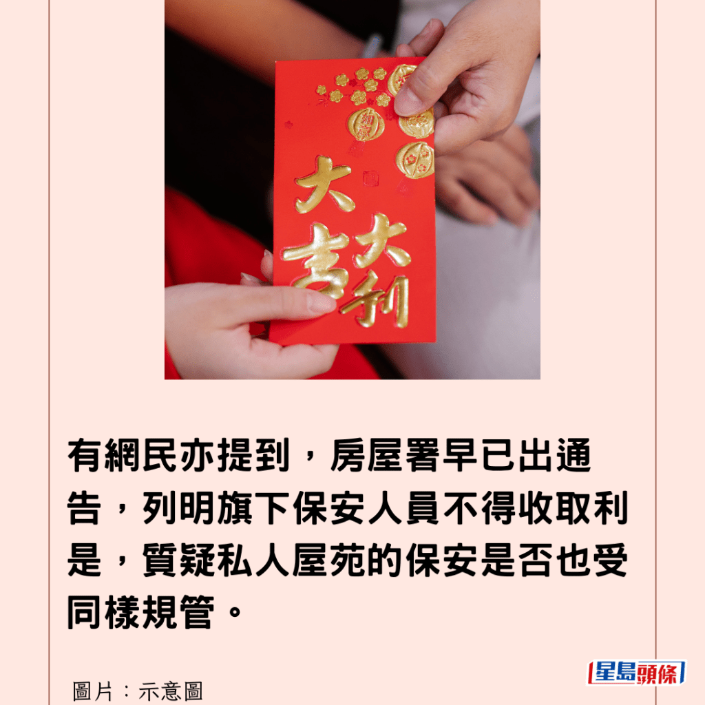 農曆新年不少人會向保安派利是,一位身兼社企老闆及前上市公司管理層的網民在社交平台發文,分享無意中遇到保安嫌20元利是金額太小,在背後指斥派的人「唔怕面懵」的經歷,令他聽到後「心裡有啲唔舒服」,陷入「面子」兩難境況。4 x: f, h- S$ e. j: l0 X" m$ Z