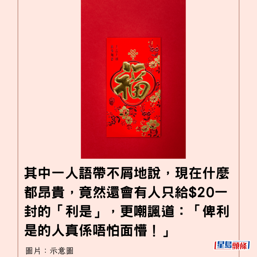 % E, v* H) n$ s5 Y4 r* Bos.tvboxnow.com樓主在社交平台發文,指日前等候升降機時,無意中聽到兩名保安員正在討論利是金額,其中一人語帶不屑地說,現在什麼都昂貴,竟然還會有人只給$20一封的「利是」,更嘲諷道:「俾利是的人真係唔怕面懵!」os.tvboxnow.com2 n# ^* s; j8 x