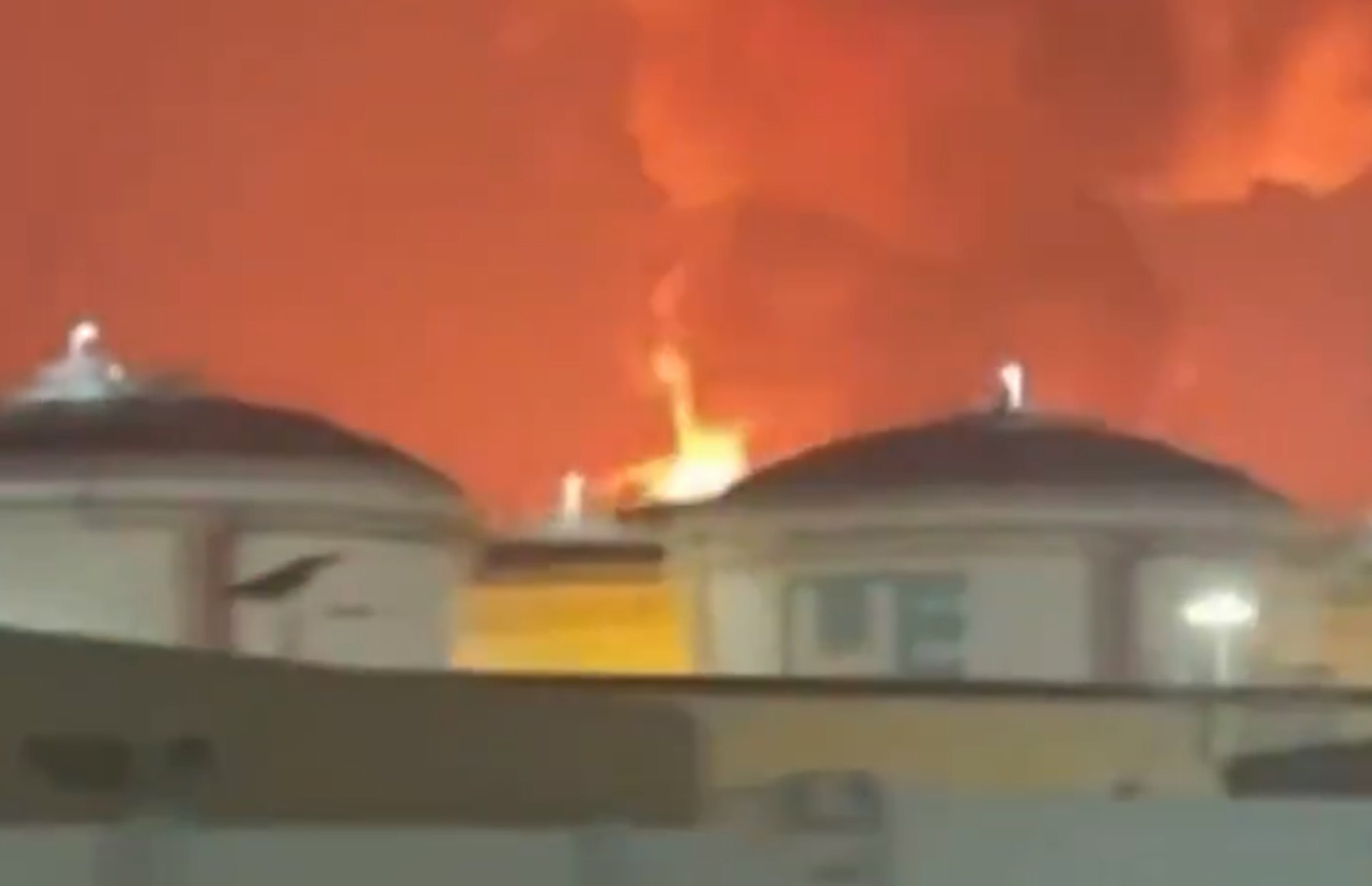 , m/ d9 `& g k根據富查伊拉媒體辦公室報道,2026年3月4日,在美以與伊朗的衝突中,阿聯酋富查伊拉石油工業區發生火災並冒出濃煙,起因是防空系統攔截無人機後產生的碎片。(影片截图)