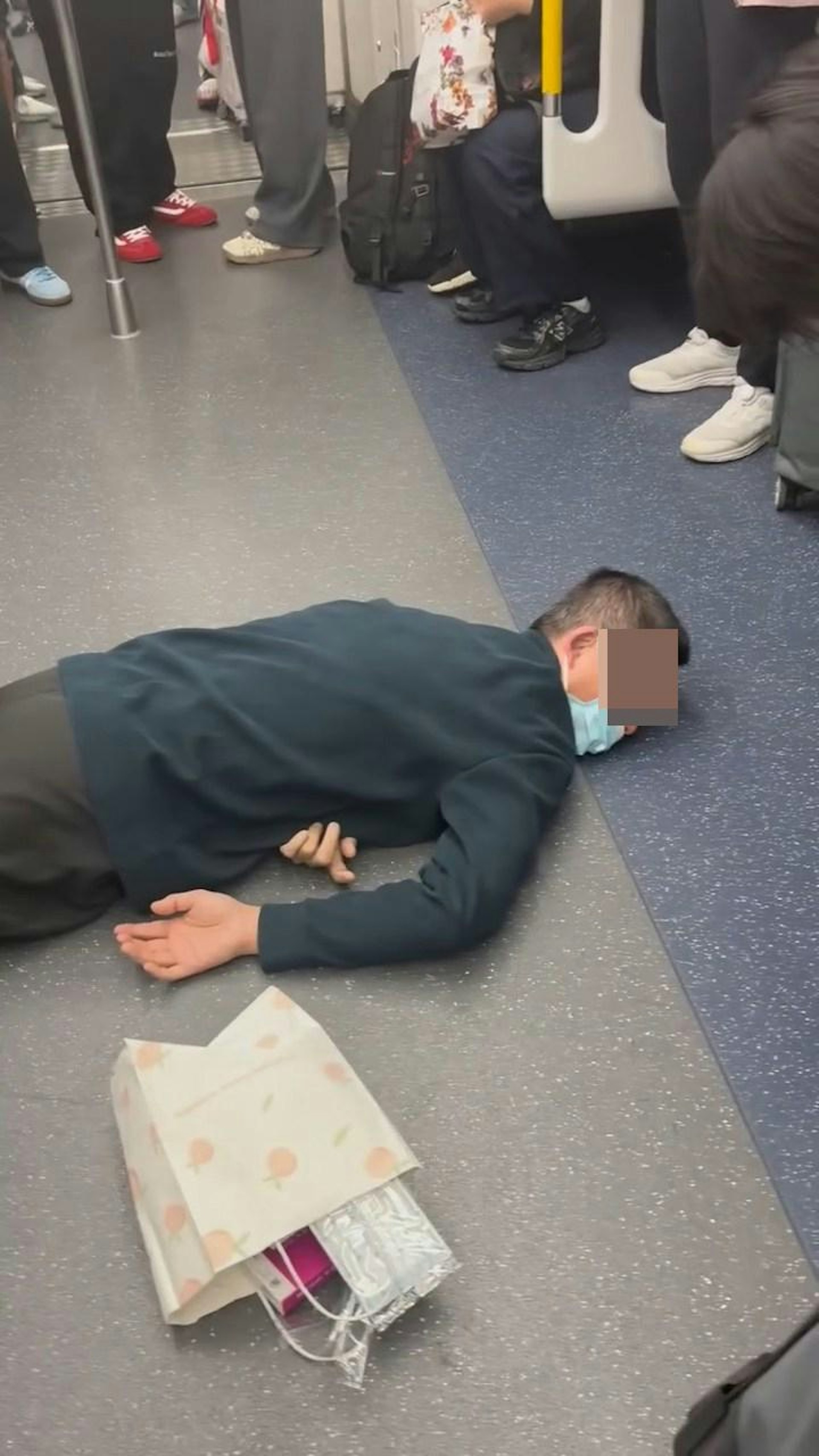 8 O* j U. w. P: P港鐵東鐵線車廂內有1名老伯跌倒在地上疑似昏迷,周圍有大批乘客圍觀。(Facebook影片截圖)