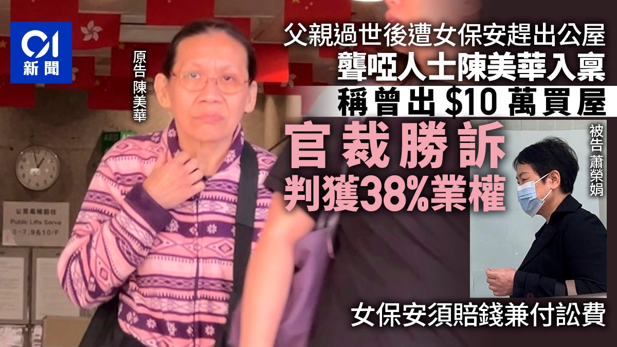 . N0 A9 U5 B/ y# z1 r4 H1 o公仔箱論壇聾啞人士美華的父親過世後,遭女保安阿娟逐出亡父留下的公屋,美華曾因而露宿家門。事件曾有電視台採訪而成城中熱話,美華最後入稟法院,聲稱曾出10萬元購屋,要求取回單位部份業權。但女保安卻堅稱美華在讓單位並無業權。案件早前經審訊後,區院暫委法官劉勝欣今(13日)頒判辭,裁定美華勝訴,並可得物業的約38%權益,女保安蕭榮娟則因非法驅逐美華,須付200元的象徵式賠償兼付訟費。