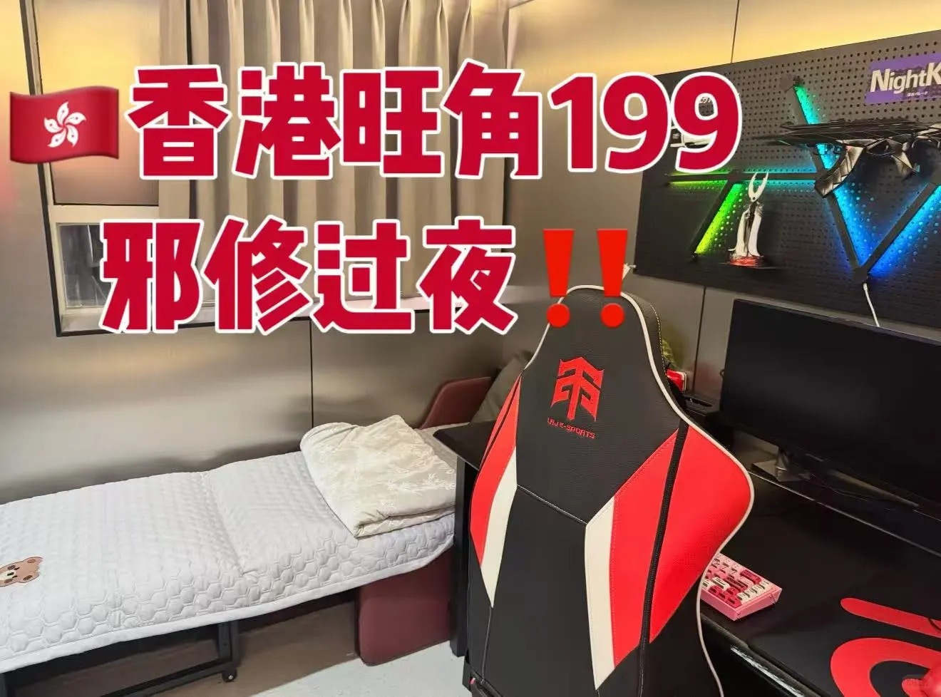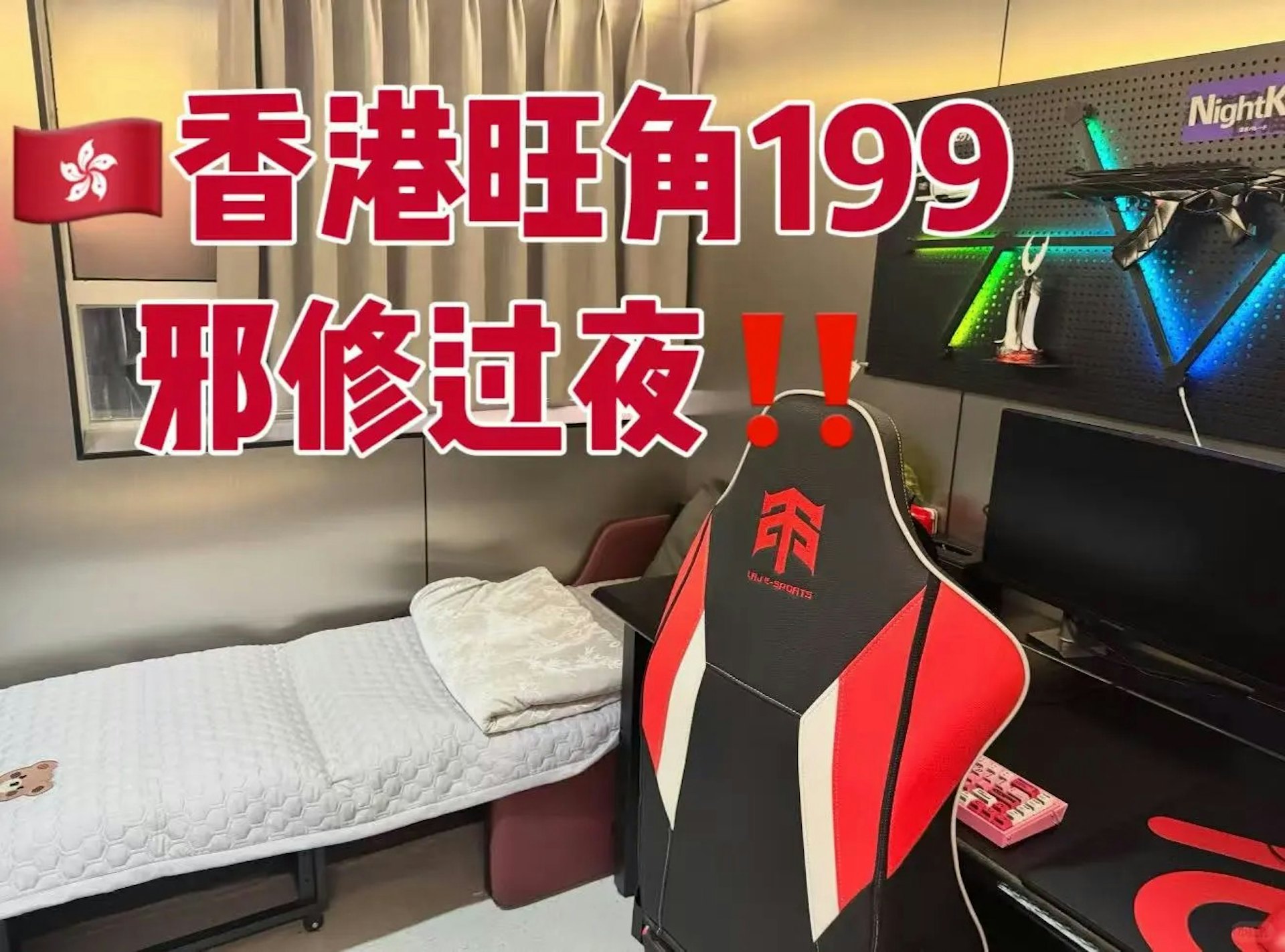 / V- s6 i0 } f1 P: h, i陸仁甲電競旺角店在小紅書宣傳「香港旺角199邪修過夜」。(小紅書圖片)