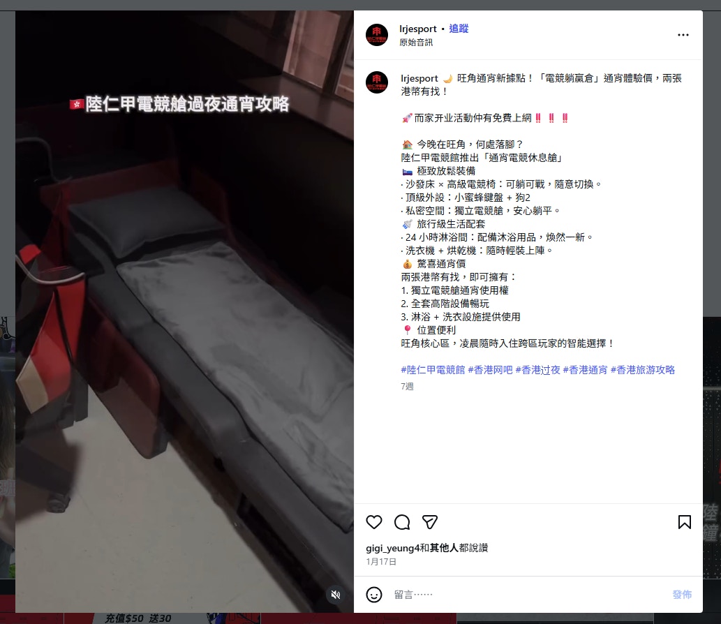 陸仁甲電競旺角店在小紅書宣傳「香港旺角不到兩張港幣電競過夜攻略」。(小紅書截圖)