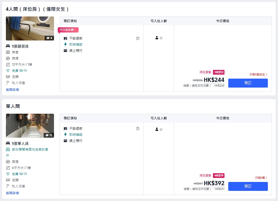 若在旅遊服務平台Trip.com,搜尋3月14日至15日(周六至周日)的賓館房價,根據其推薦頁面,大部份房價約200元至400元,以香港銅鑼灣賓館為例,最便宜的碌架床位連稅收268元,即床價與陸仁甲電競相近,卻需要與三名陌生人同住一房。