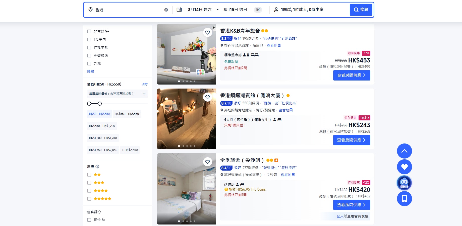 若在旅遊服務平台Trip.com,搜尋3月14日至15日的旅館房價,大部份索價約200元至400元。(網頁截圖). J) n- z* _& u3 W7 ^6 B2 w