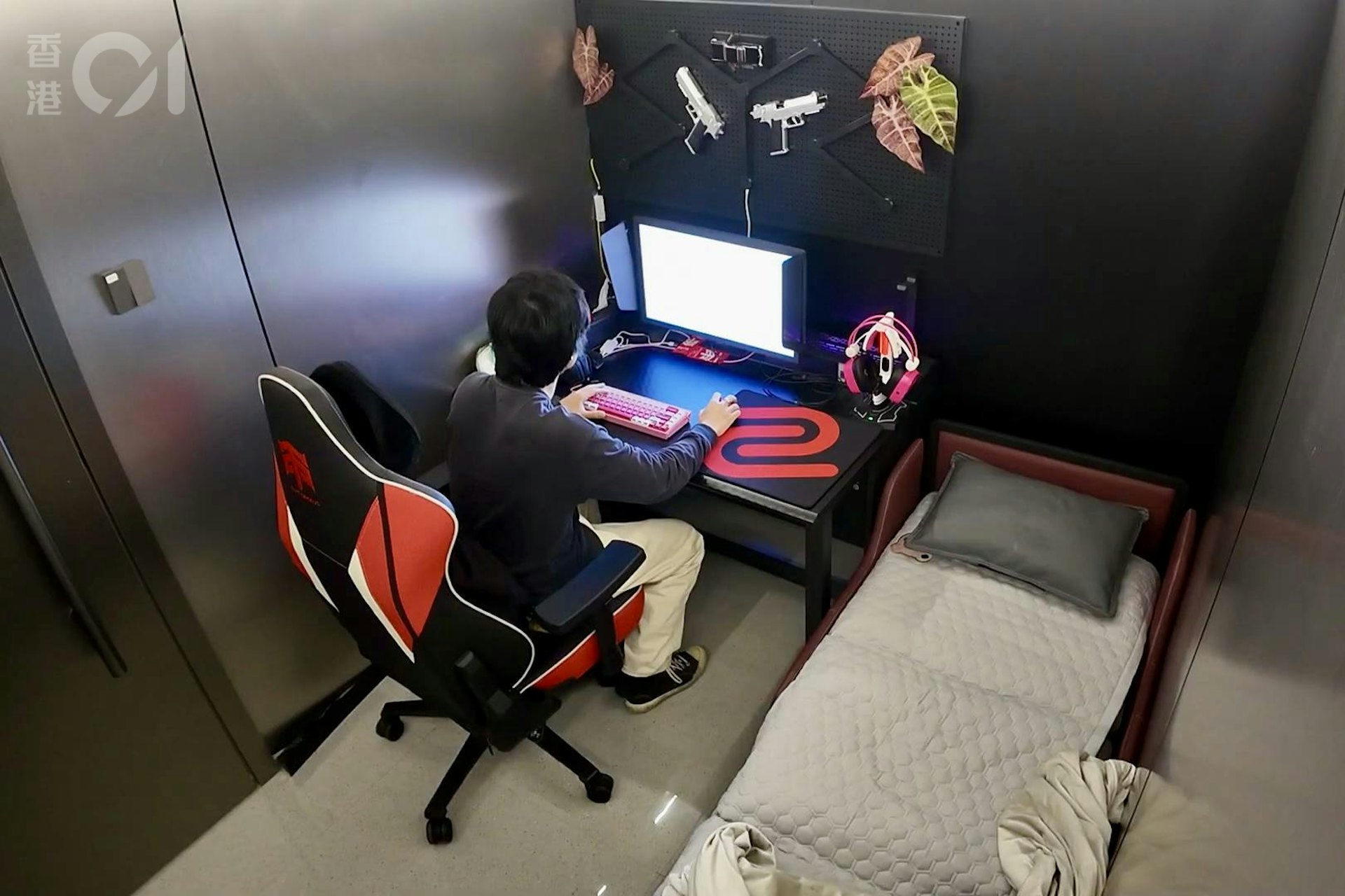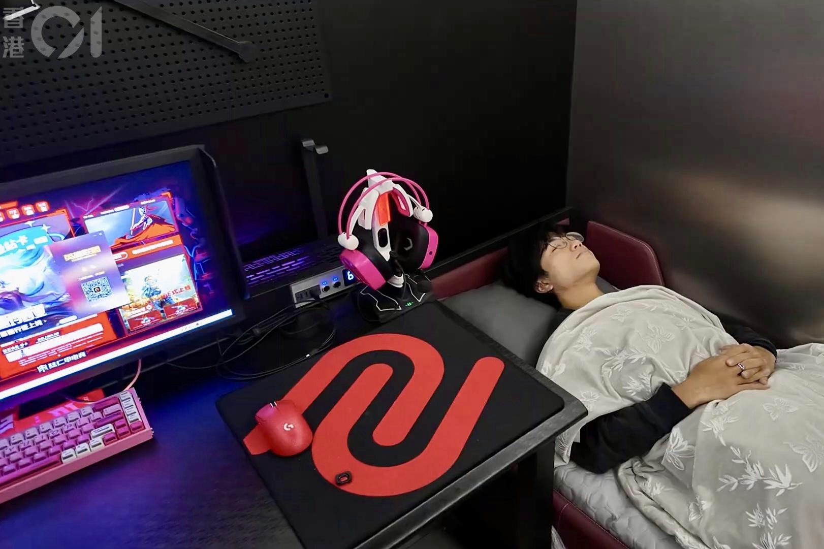 記者租用的包廂面積不算大,剛好能容納一個人,雖然不設窗戶,但光線充足及空氣流通,電腦裝有RTX 5070系列顯示卡,旁邊放有電競椅、及一張由單人座梳化變身成約1.8米長的單人床供玩家休息,天花板裝有閉路電視鏡頭,整體感覺不錯。而床墊的軟硬度適中,可惜床位狹窄,若要轉身則略嫌空間不足,但相信過夜一晚並無太大不便。