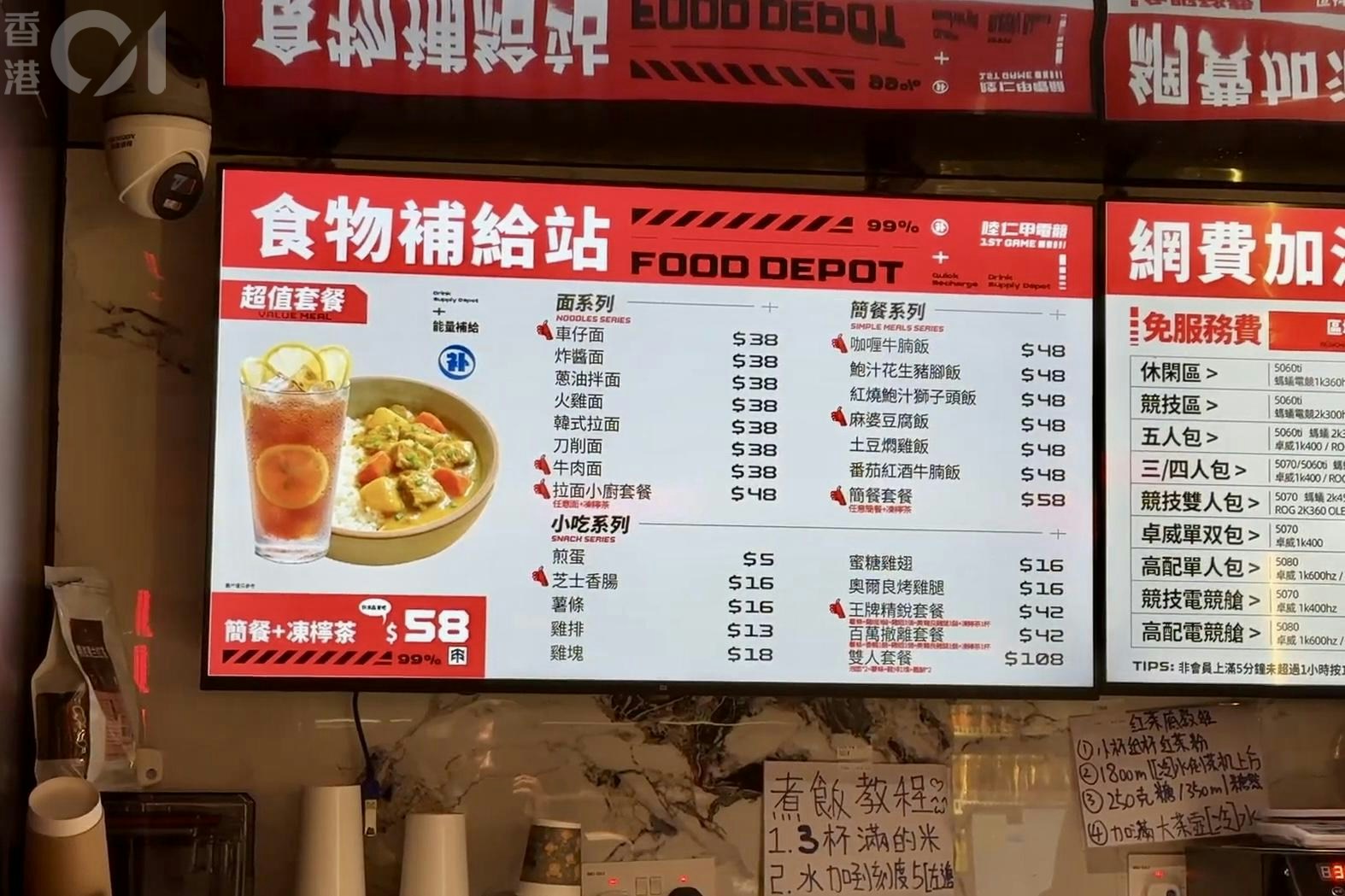 陸仁甲電競館內提供餐飲服務\,根據前台上方的餐牌,有六款飯類包括咖哩牛腩飯及麻婆豆腐飯等,全部收48元;七款麵食包括炸醬麵及車仔麵等,全部收38元;小吃有蜜糖雞翼及芝士香腸等,介乎5至42元不等。若玩家在電腦系統查閱餐牌,選擇更為豐富,頁面顯示提供樽裝飲品及即食麵等零食,惟價錢高於一般便利店。TVBNOW 含有熱門話題,最新最快電視,軟體,遊戲,電影,動漫及日常生活及興趣交流等資訊。( o& x6 W- g+ s) ~
