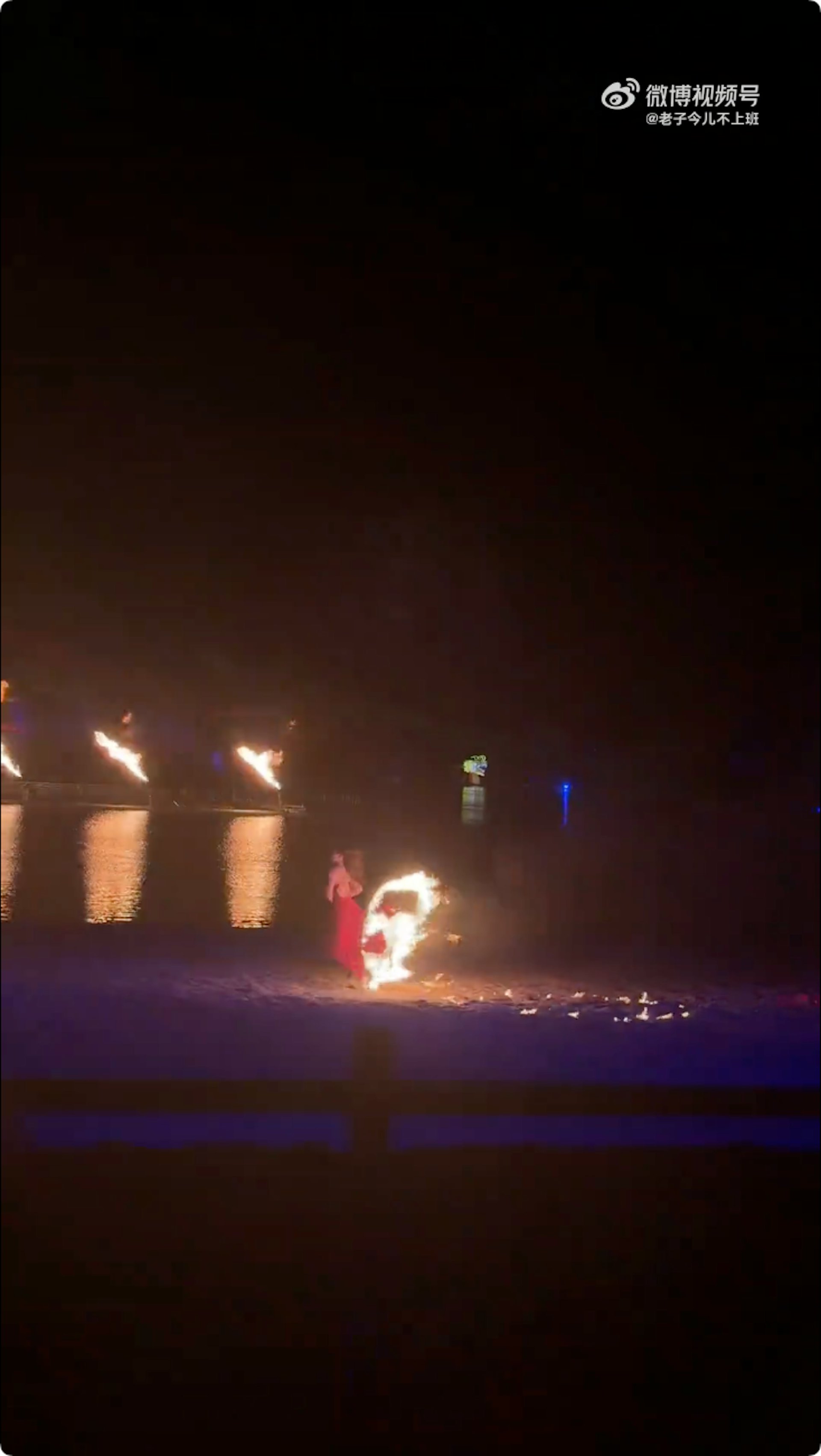 影片顯示,當晚戶外表演現場,一名女演員蹲在地上,紅色裙擺散開圍在身旁。兩名工作人員手持火把點燃裙擺。火焰沿裙擺開始燃燒後,表演者雙手隨之舞動,後來站起轉圈時,火勢並未減弱,她試圖解開裙擺未果,於是迅速跑向一旁的湖中,跳入淺水區撲滅火勢。