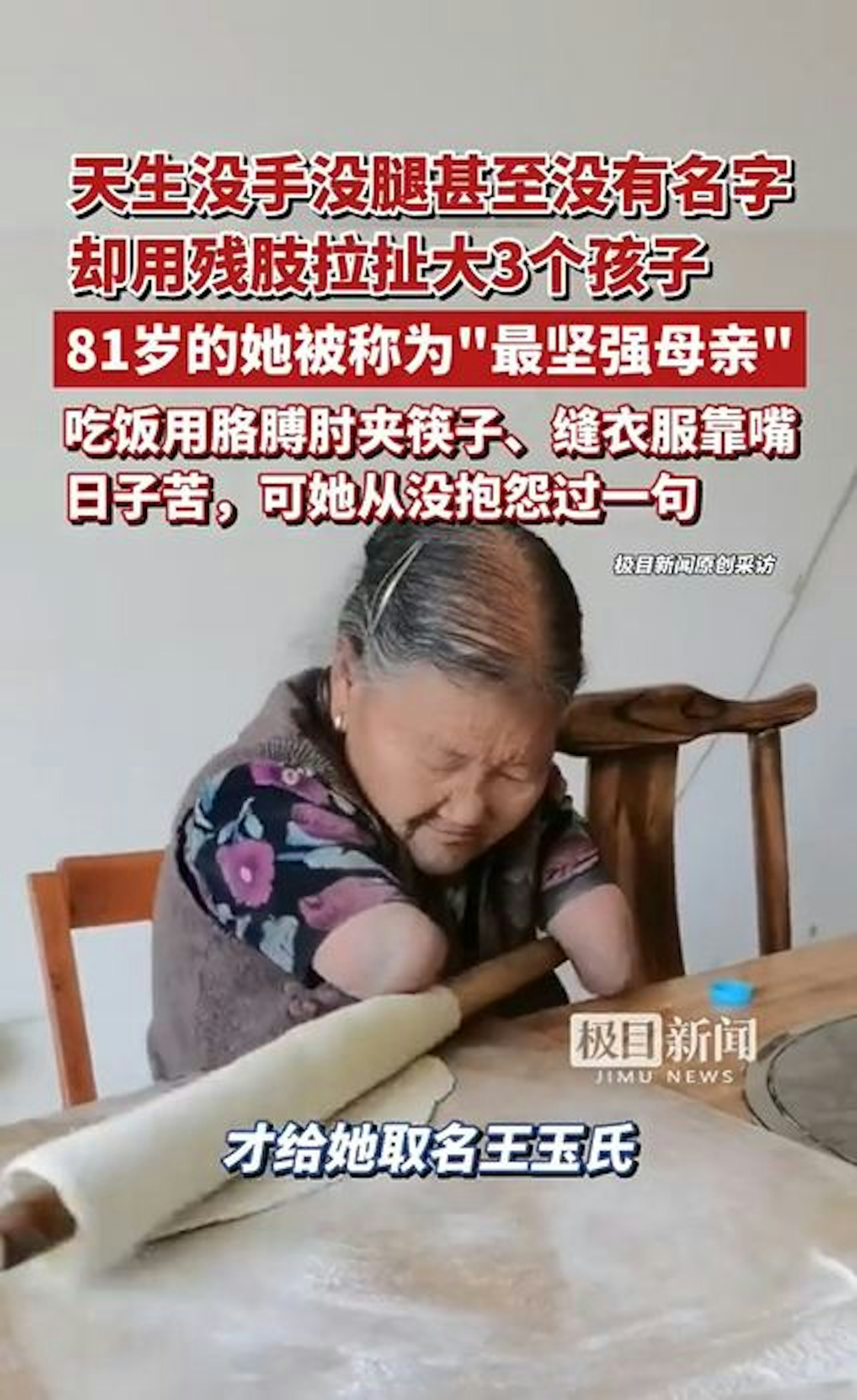 內地甘肅省白銀縣的81歲婦人王玉氏先天四肢不全,卻憑著自己堅韌的力量撫養3個子女長大。(微博@極目新聞)