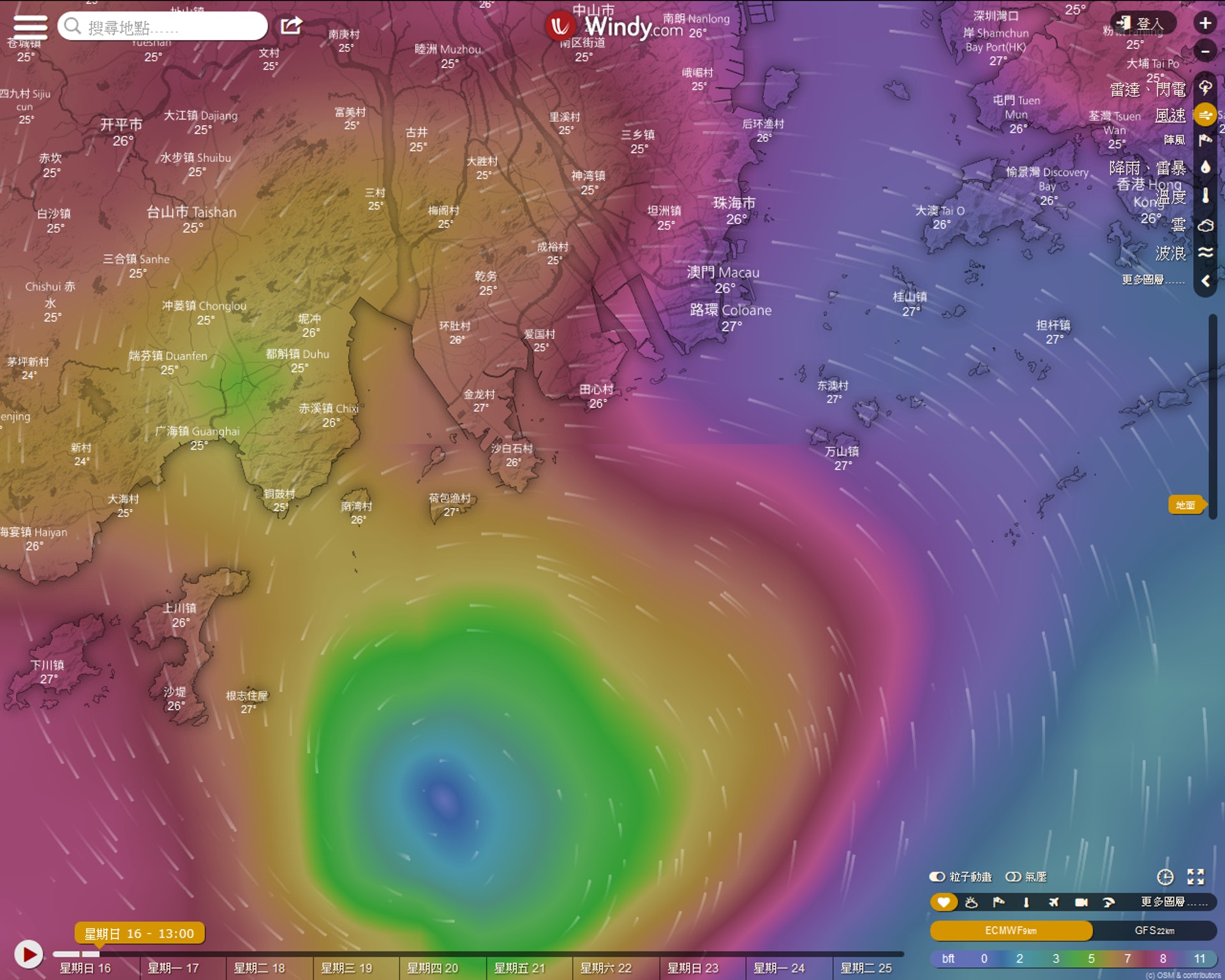 歐洲中期天氣預報中心(ECMWF)預測山竹在9月16日(周日)07時的位置。(網上截圖)$ K. J4 v/ G) W% Z