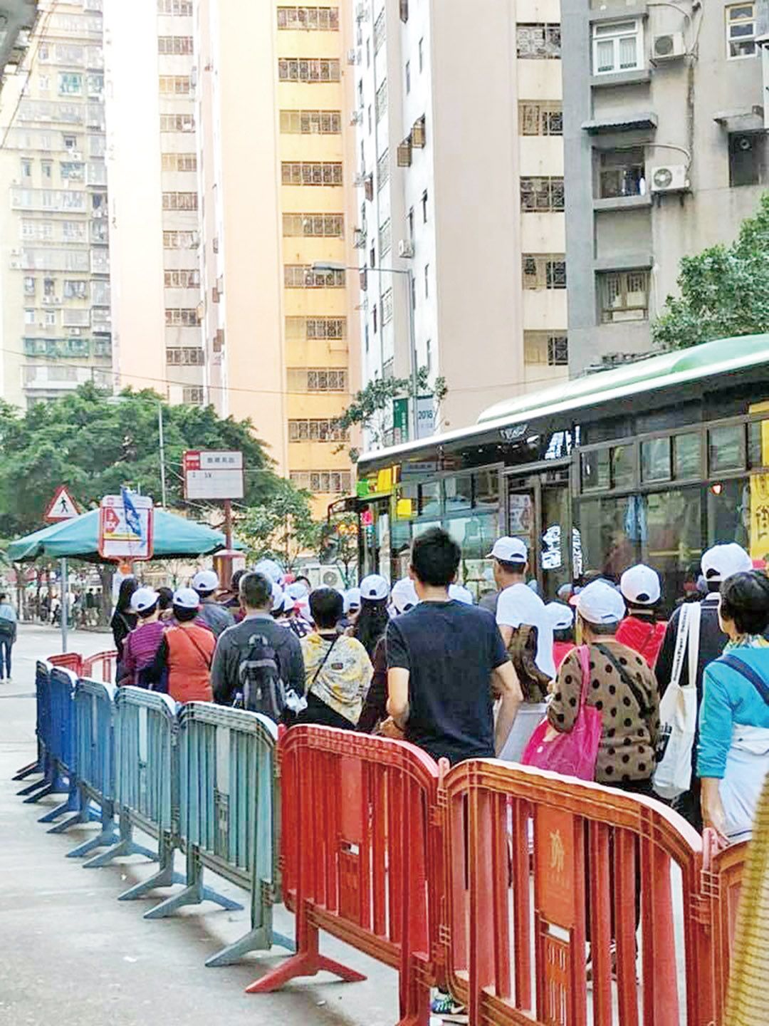 一團頭戴白帽的團友則由「導遊」帶領下欲乘搭公共巴士。 (澳門電台圖片)