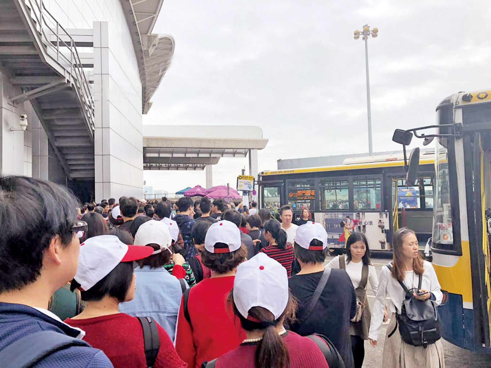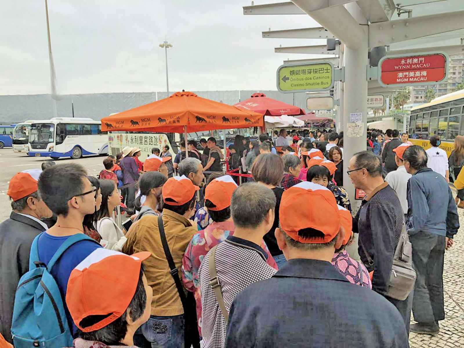 一大群頭戴橙帽的疑似非法導遊帶領的旅行團團友,在關閘口岸等候乘坐「發財巴」出行。 (澳門電台圖片)