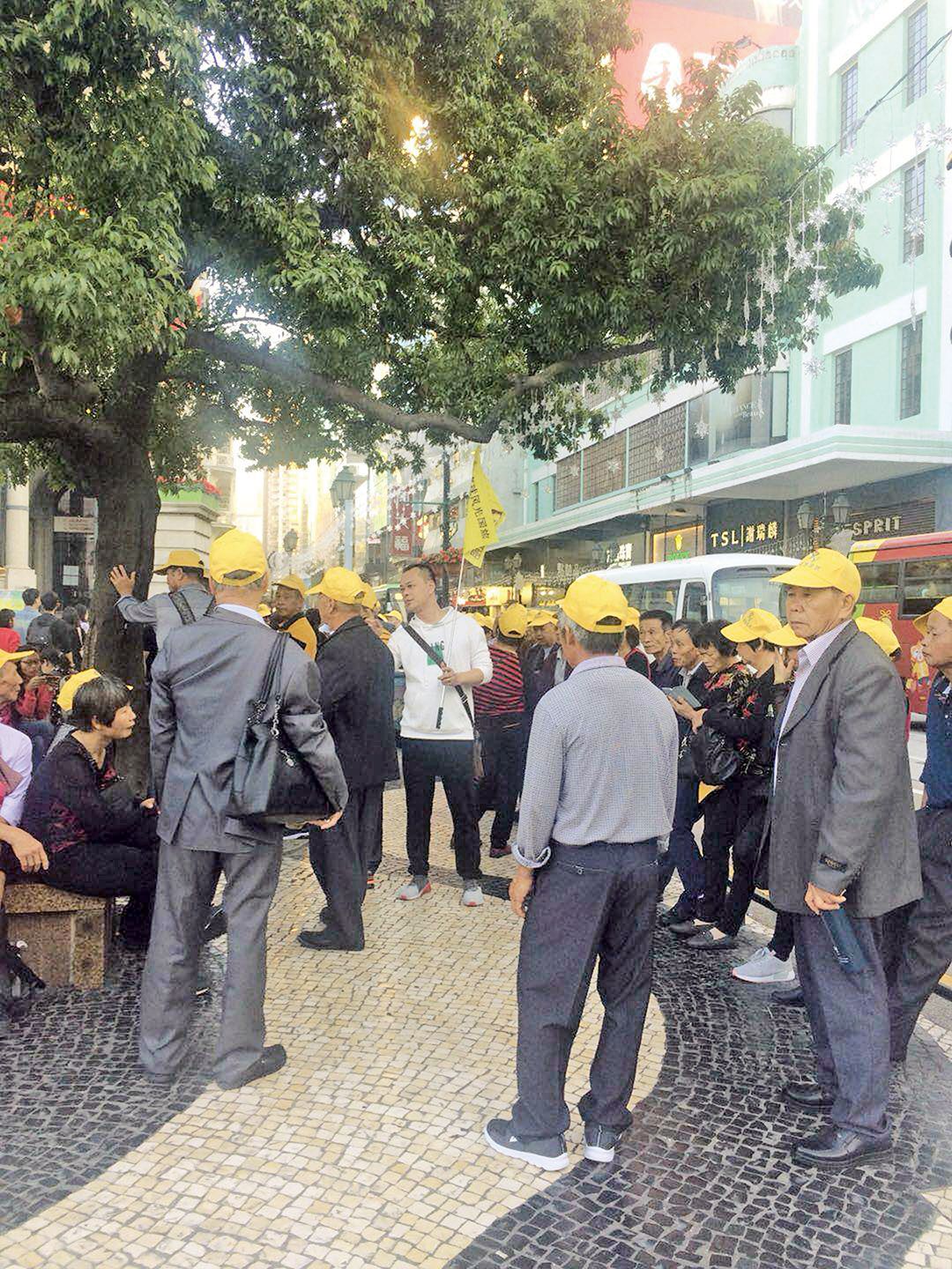 有非法導遊帶團到澳門後,由團中的負責人向團友分發識別身份的帽子。(澳門電台圖片)