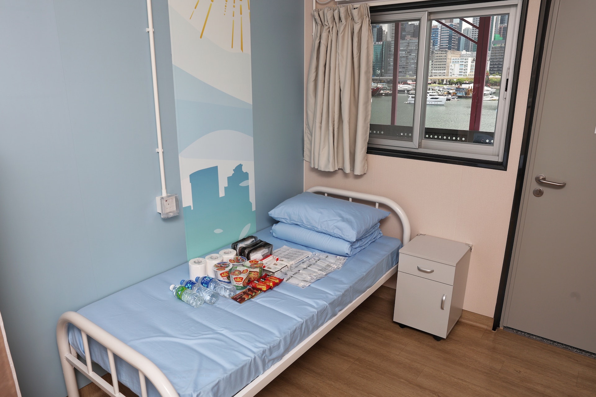 ' f- L% }, _4 r& S% W4 M啟德方艙醫院位處海旁,可一覽觀塘避風塘。圖中為打通了的相連房間,可供家庭入住,除了一張碌架床,更有兩張單人床。(李澤彤攝)