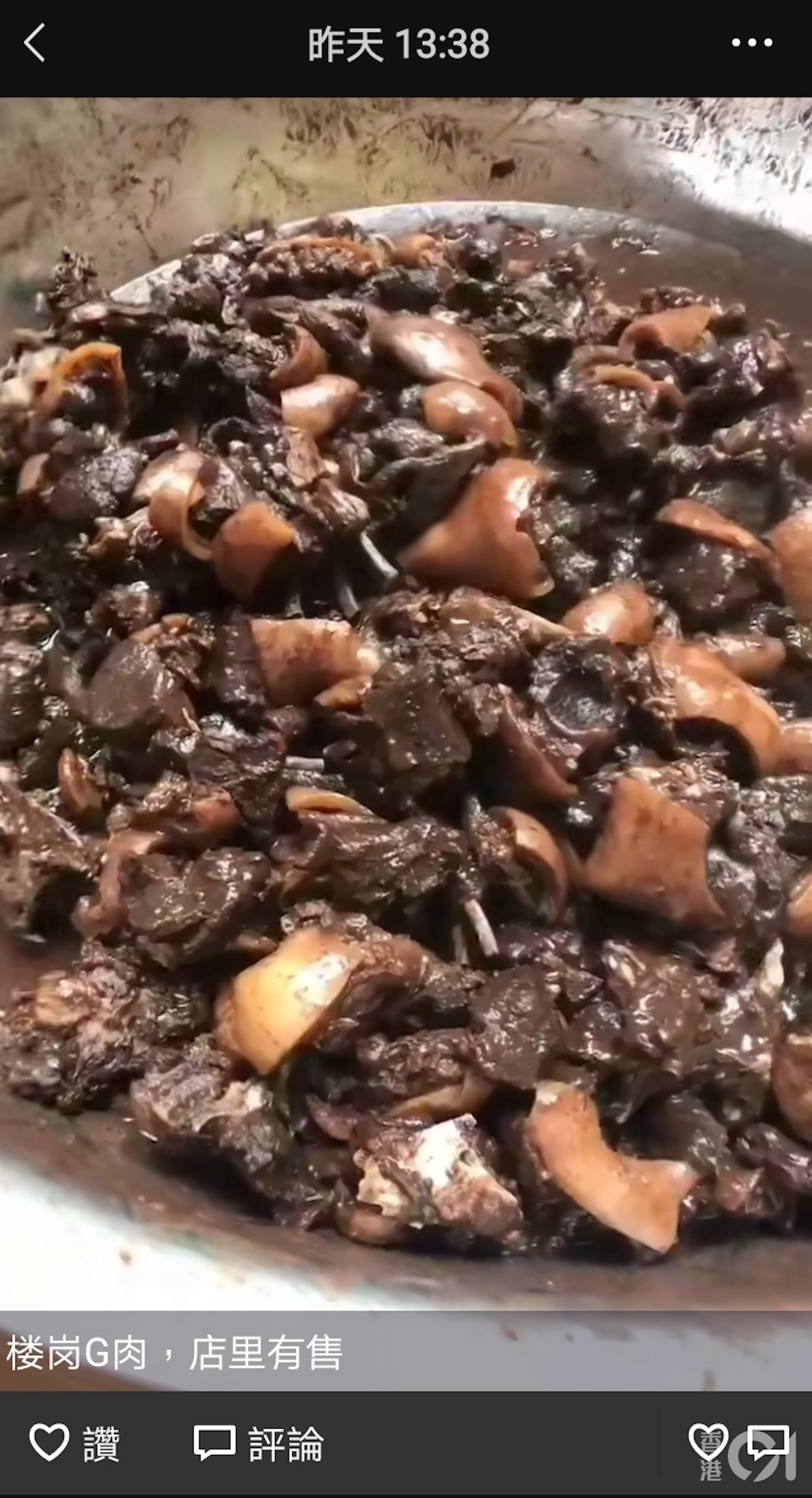 「G肉」似是加入柱候醬烹煮,加熱後散發濃烈的醬料味,部份肉塊上有淺色毛髮;有部位呈長條形,亦有一截懷疑是狗隻的尾巴。) a* @( t/ R$ O8 Q9 k* B2 i, d