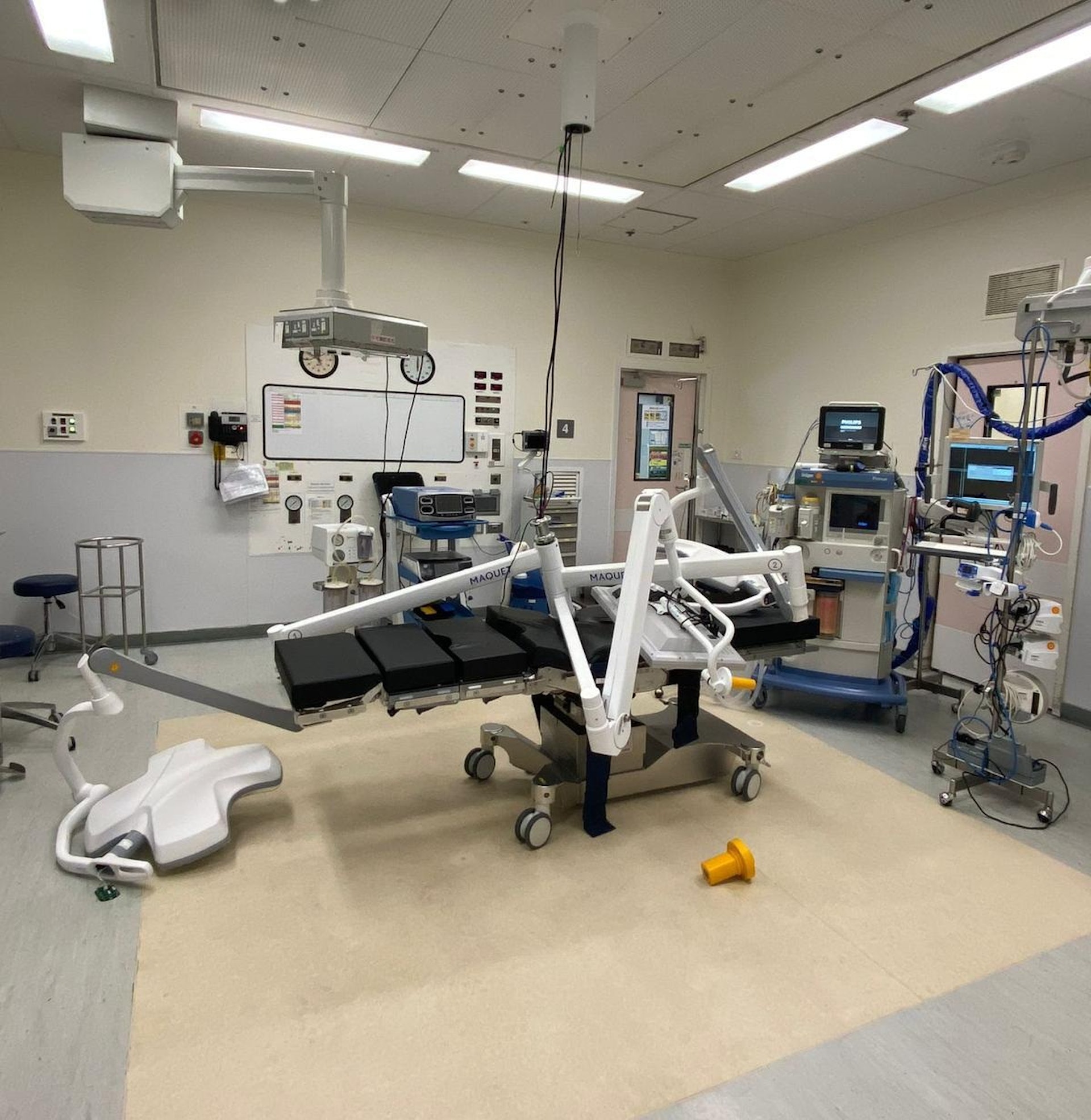 相片可見,聯合醫院一間手術室的全組手術燈從天花墮在手術床上。
