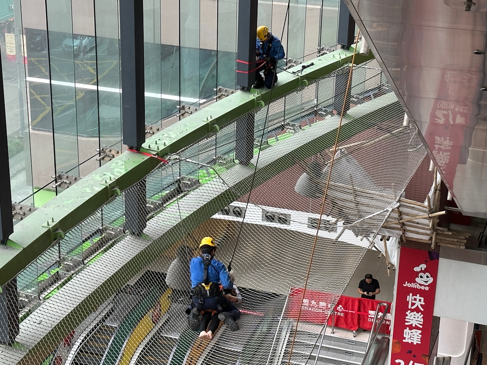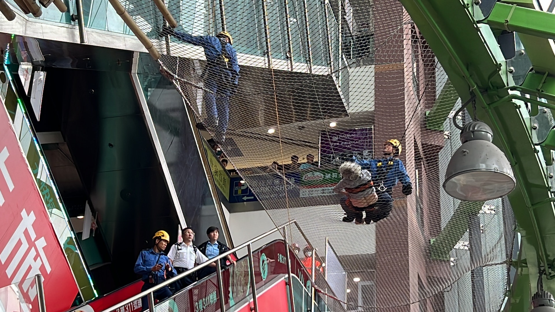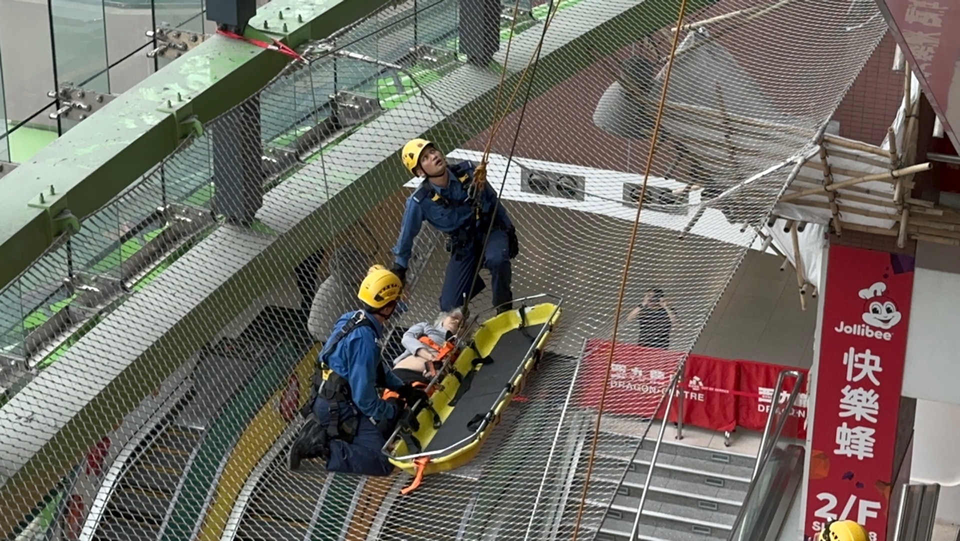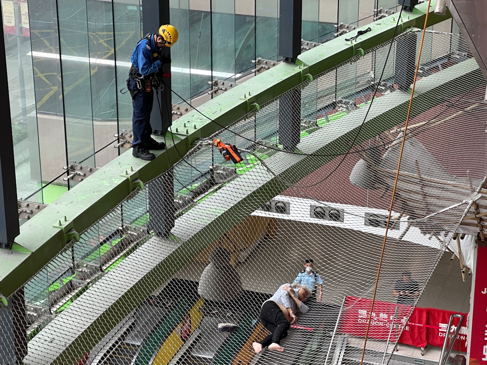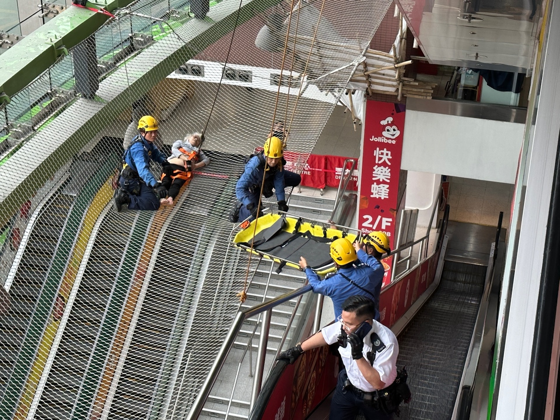 今日(17日)上午9時26分,深水埗西九龍中心有途人報案,指一名年約70歲的老婦疑高處墮下,跌在3樓的安全網內,神智清醒。救援人員接報到場,由扣上安全帶的一名消防員走入網內,替老婦扣上安全帶,然後小心翼翼將她扶起放在「山兜」內抬起,最後由救護車送到瑪嘉烈醫院治理。