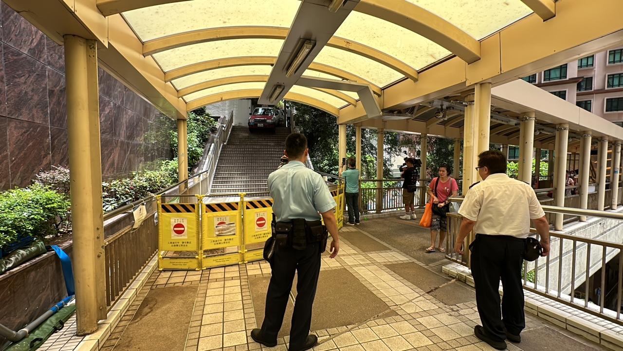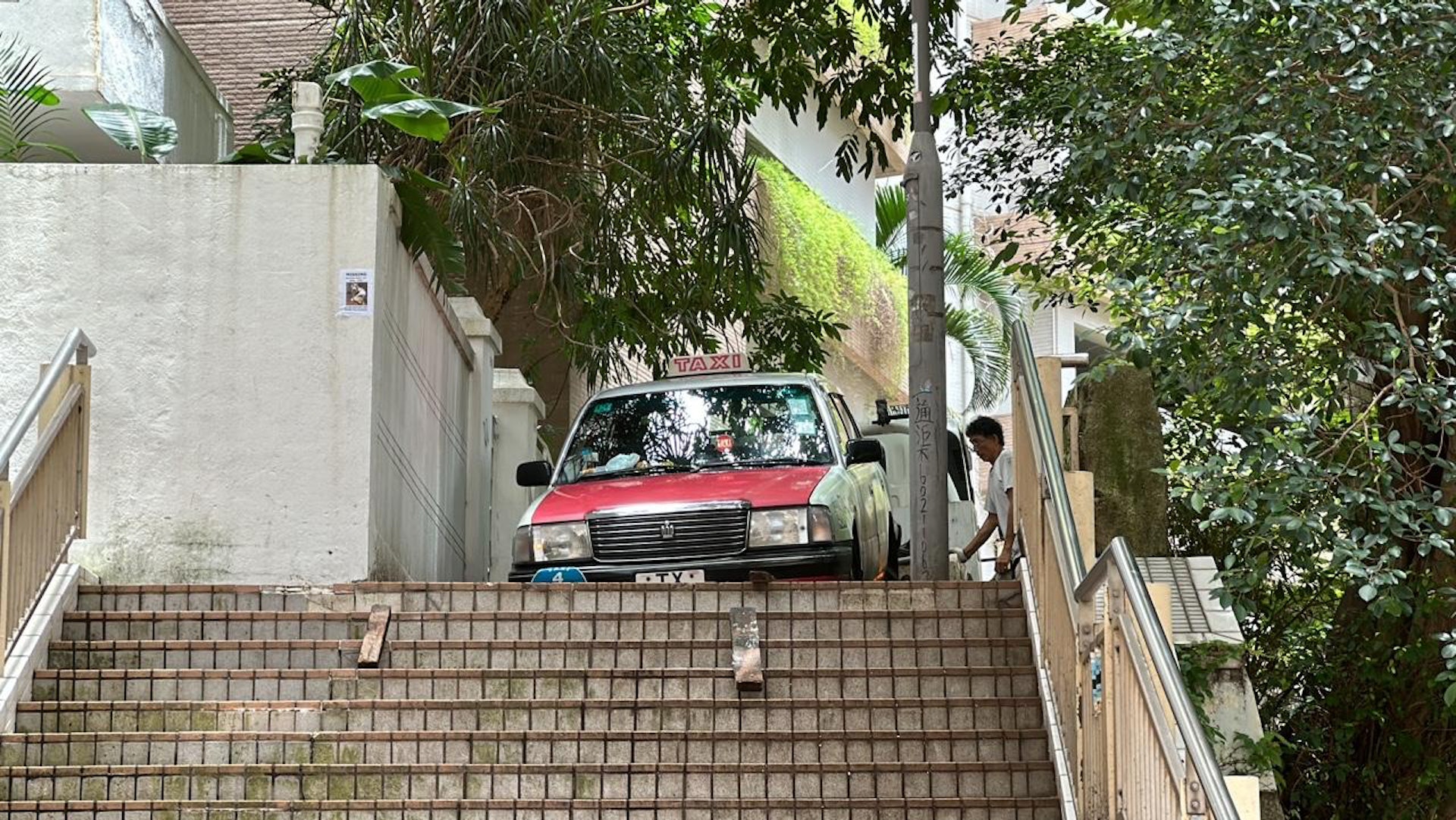 0 ?7 U7 ^" a( ^2 ^/ `7 c今日(3日)上午11時23分,七旬的士司機駕駛空載的士,在港島西半山羅便臣道疑行錯路,進入私人屋苑行人路,幾乎衝落樓梯往半山扶手電梯。的士兩條前胎已經跌出梯級,甚是驚險,司機沒有受傷,但無法落車,報警求救。