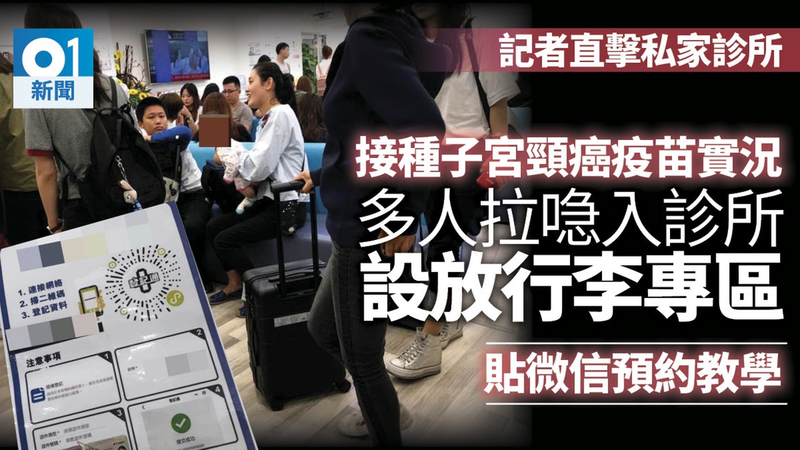 # |! h; E. I. \公仔箱論壇診所內人頭湧湧,門口預留了位置擺放行李箱,牆上貼有告示教客人如何經微信預約注射疫苗,有職員透露現時診所有九價HPV疫苗可注射,惟不設現場登記,只可以網上預約,預約成功會收到確認信息,職員又指現時三針的售價為5,500元。