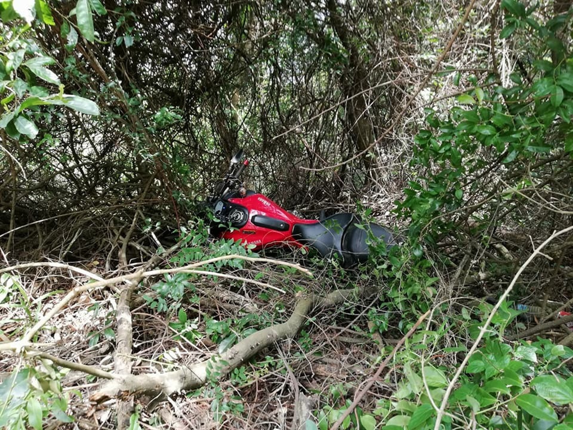 1 i; _4 n' p( d) k. r2 H9 L3 z# M: k' ?公仔箱論壇鐵騎連人帶車剷入樹叢。(網民Kim Chan上載至fb群組)' Q* N4 [/ Y7 ~) s" z# s1 c w
