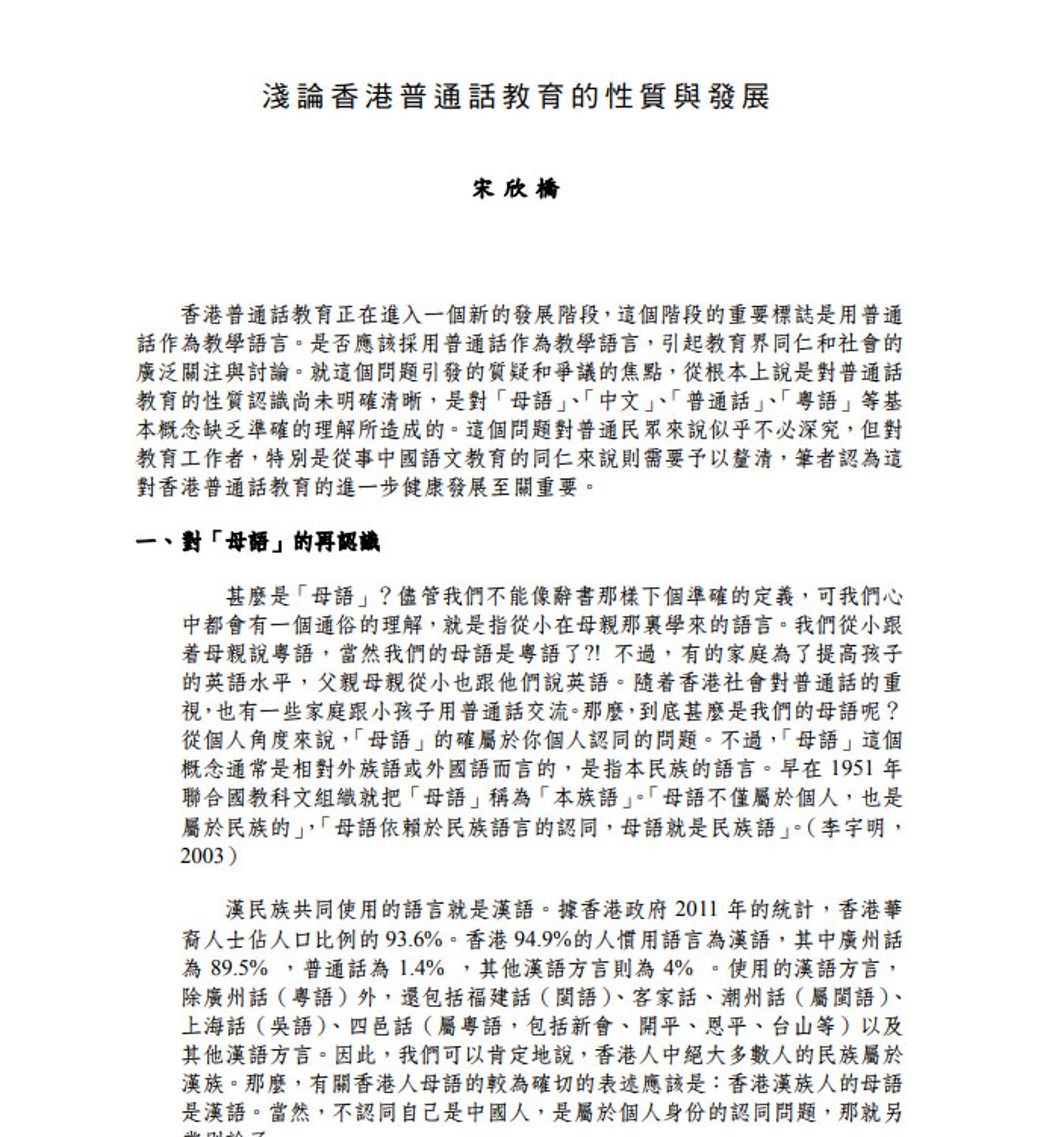 惹起爭議的文章「淺論香港普通話教育的性質與發展」是由中大普通話教育研究及發展中心榮譽專業顧問宋欣橋所寫,文章可以在教育局網頁「普通話(小學)-教學資源」中的課程配套資料的頁面找到。文章中提到「對『母語』的再認識」,文章引述內地學者表示「母語就是民族語」,由此推論「一種語言中的方言不能視為『母語』」,而香港人中絕大多數人屬於漢族,因此香港人的母語應為「漢民族共同語」,即普通話。公仔箱論壇( Q: f3 q' t$ @6 I+ s+ C7 }. {