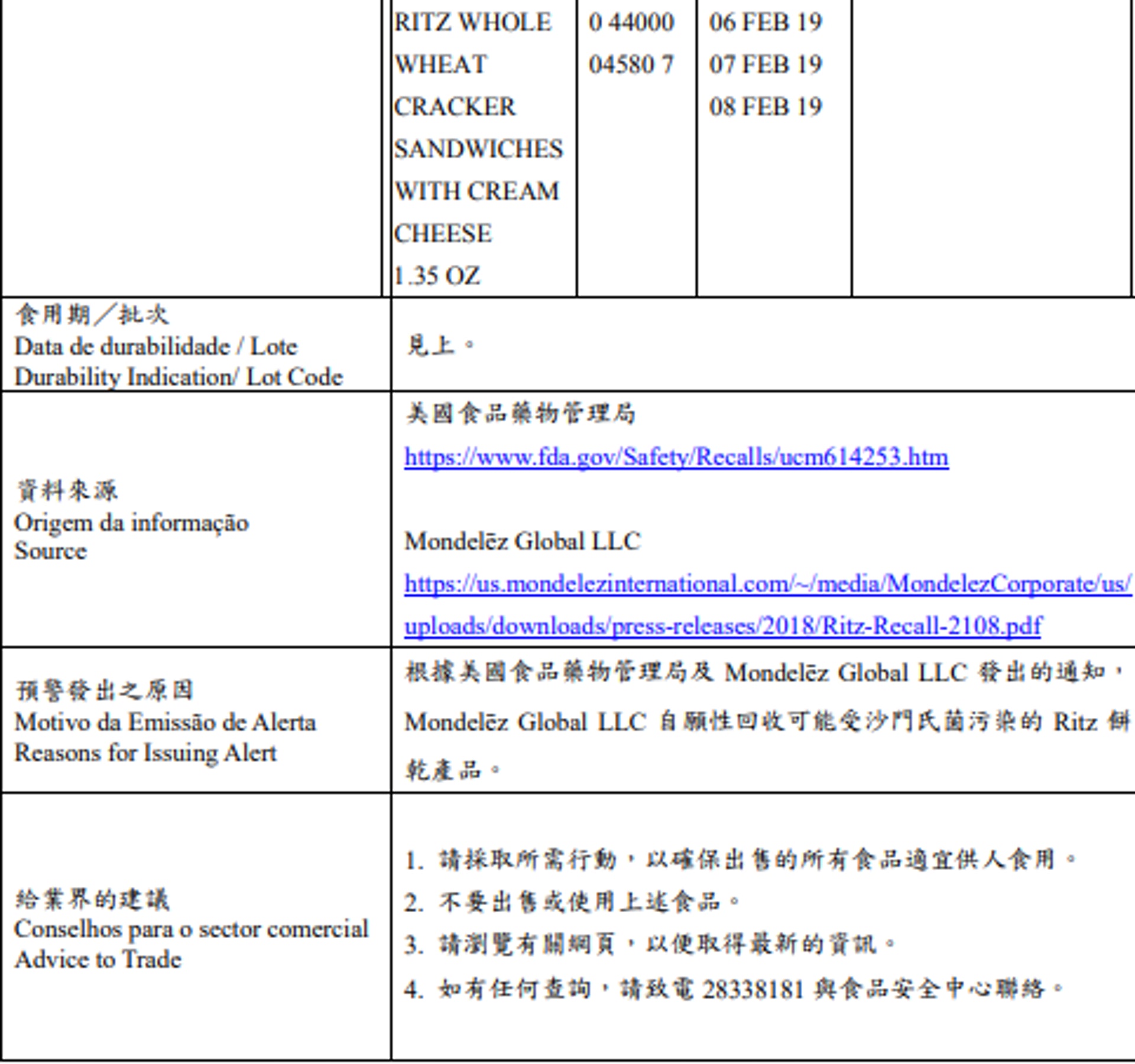 全球最大零食生產商之一Mondelēz Global LLC上周六(21日)宣布,發現部分材料或受沙門氏菌污染,遂自願回收部分在美國發售的Ritz品牌餅乾,當中包括於超市常見的迷你版芝士夾心餅乾(RITZ BITS CHEESE 1 OZ,利脆牌芝士夾心餅)。本港食安中心暫無相關公告,不過澳門民政總署則發出食品預警,呼籲業界停售相關批次產品。tvb now,tvbnow,bttvb7 P+ p: x" a/ [ X